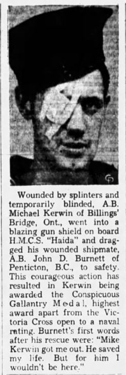 Citation for Conspicuous Gallantry Medal: KERWIN, Michael Roderick, Able Seaman, V32313, Conspicuous Gallantry Medal (CGM), RCNVR, HMCS HAIDA - Awarded as per Canada Gazette of 20 January 1945 and London Gazette of 14 November 1944. "During one action on 5th - 6th of August, a fierce fire broke out at 'Y' Gun in HMCS HAIDA as a result of the explosion of a cordite charge and the ignition of oil from the damaged hydraulic system. The fire was centred in right gun shield. Able Seaman Kerwin, although blinded and wounded by splinters, went into the blazing gun shield at great risk to his own life and dragged out an injured man to safety. Both were badly burned, but Able Seaman Kerwin's prompt and gallant action saved the life of his shipmate."