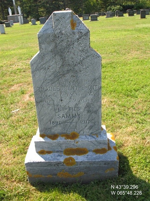 Headstone for Anselme d'Entremont in the St-Pierre Cemetery, West Pubnico, NS. note: the headstone shows Sammy, an anglicized version of Anselme.