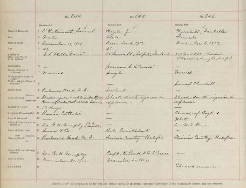 d'ENTREMONT, Anselme Joseph Guillaume, died 19 Dec 1917, Steam Tug Stella Maris - "of shock and injuries in explosion.. Burns of limbs, chest and neck. Toxemia." in the Victoria General Hospital, Halifax. He was the son of Thadée d`Entremont and Vênérante d`Entremont . He was born and grew up in West Pubnico. He was married to Marie-Heniette d`Entremeont. He had two children, Jeanne May October 5 1913 and Lawrence Anselme born 1915. His residence listed on his death certificate was SS Stella Maris. He is buried with his father at West Pubnico in the St-Pierre Cemetery. There is a photo of his grave stone but none has been found of him. He appeared in the 1891 and the 1901 Canadian Census in West Pubnico. (Researched by Bruce Brannen)