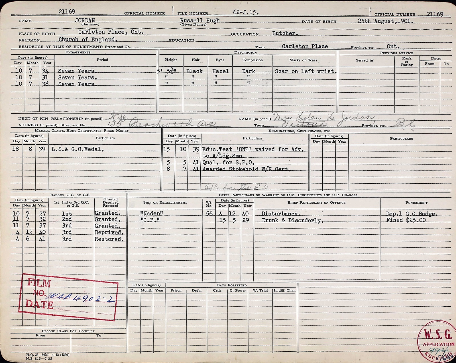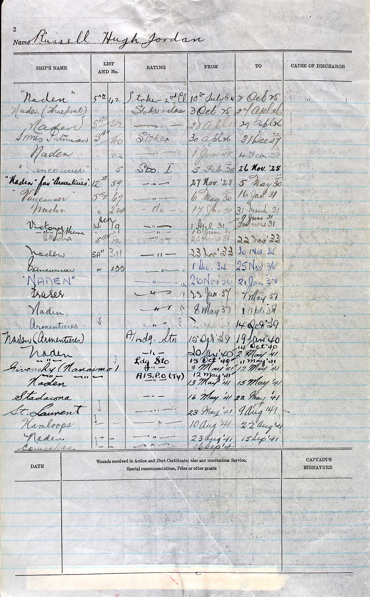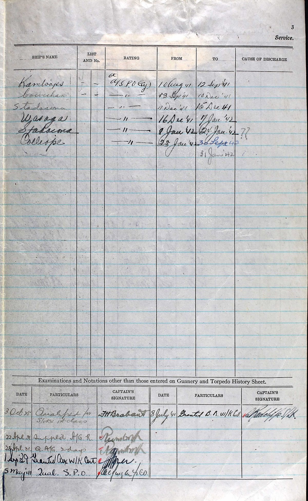 Ships served in: HMCS NADEN - Enlisted 10 Jul 1924 as a Stoker 2nd Class, RCN HMCS THIEPVAL - Served in THIEPVAL 03 Oct 1925 - 27 Apr 1926 as a Sto 1c, RCN HMCS PATRICIAN - Served in PATRICIAN 30 Apr 1926 - 31 Dec 1926 as a Sto 1c, RCN HMCS VANCOUVER - Served in VANCOUVER 05 Feb 1928 - 26 Nov 1928 as a Sto 1c, RCN HMCS ARMENTIERES - Served in ARMENTIERES 27 Nov 1928 - 05 May 1930 as a Sto 1c, RCN HMCS VANCOUVER - Served in VANCOUVER 06 May 1930 - 16 Jan 1931 as a Sto 1c, RCN HMS VICTORY - Served in VICTORY - 01 Apr 1931 - 09 Jun 1931 as a Sto 1c, RCN HMCS SKEENA - Served in SKEENA 10 Jun 1931 - 22 Nov 1933 as a Sto 1c, RCN HMCS VANCOUVER - Served in VANCOUVER 01 Dec 1934 - 25 Nov 1936 as a Sto 1c, RCN HMCS FRASER - Served in FRASER 22 Jan 1937 - 07 May 1937 as a Sto 1c, RCN HMCS ARMENTIERES - Served in ARMENTIERES 02 Apr 1938 - 19 Jan 1940 as a Sto 1c and A/L/Sto, RCN. Rated A/L/Sto 15 Dec 1939 HMCS NANAIMO - Served in NANAIMO 03 May 1941 - 12 May 1941 as an L/Sto and A/Sto PO, RCN. Rated A/Sto Po 12 May 1941 HMCS ST LAURENT - Served in ST LAURENT - 23 May 1941 - 09 Aug 1941 as an A/Sto PO, RCN HMCS KAMLOOPS - Served in KAMLOOPS 10 Aug 1941 - 12 Sep 1941 as an A/Sto PO, RCN HMCS COWICHAN - Served in COWICHAN 13 Sep 1941 - 10 Dec 1941 as an A/Sto PO, RCN HMCS WASAGA - Served in WASAGA 16 Dec 1941 - 07 Jan 1942 as an A/Sto PO, RCN HMS CALLIOPE (Royal Navy base, Gateshead, Tyne and Wear) - Drafted to CALLIOPE 25 Jan 1942 HMS BELMONT - for passage to HMS CALLIOPE 25 Jan 1942