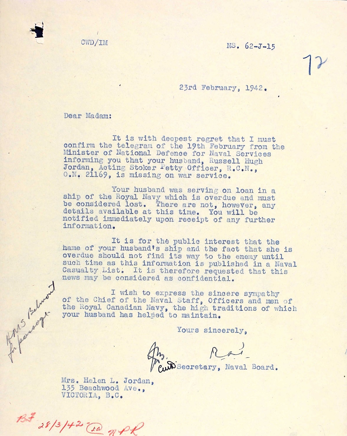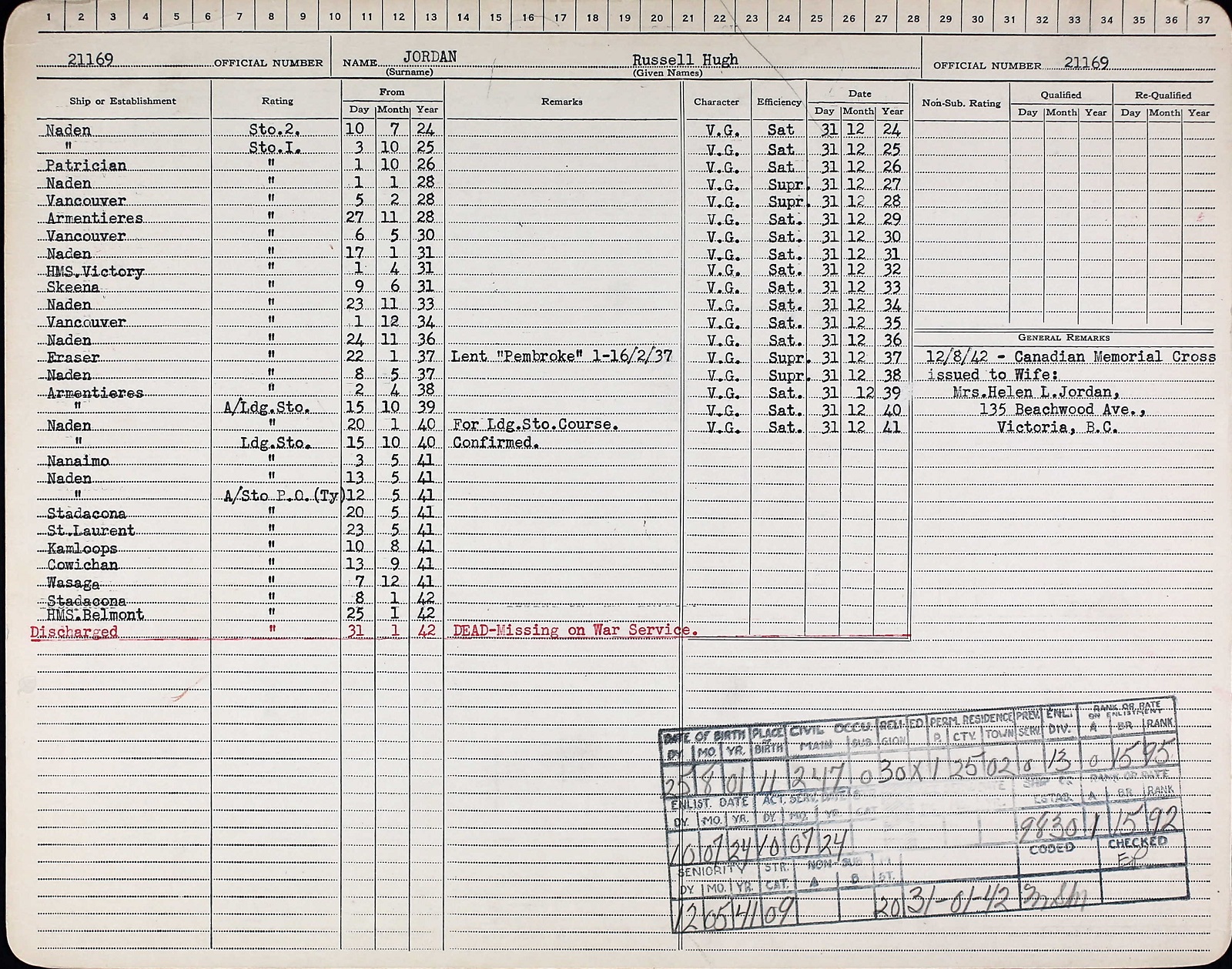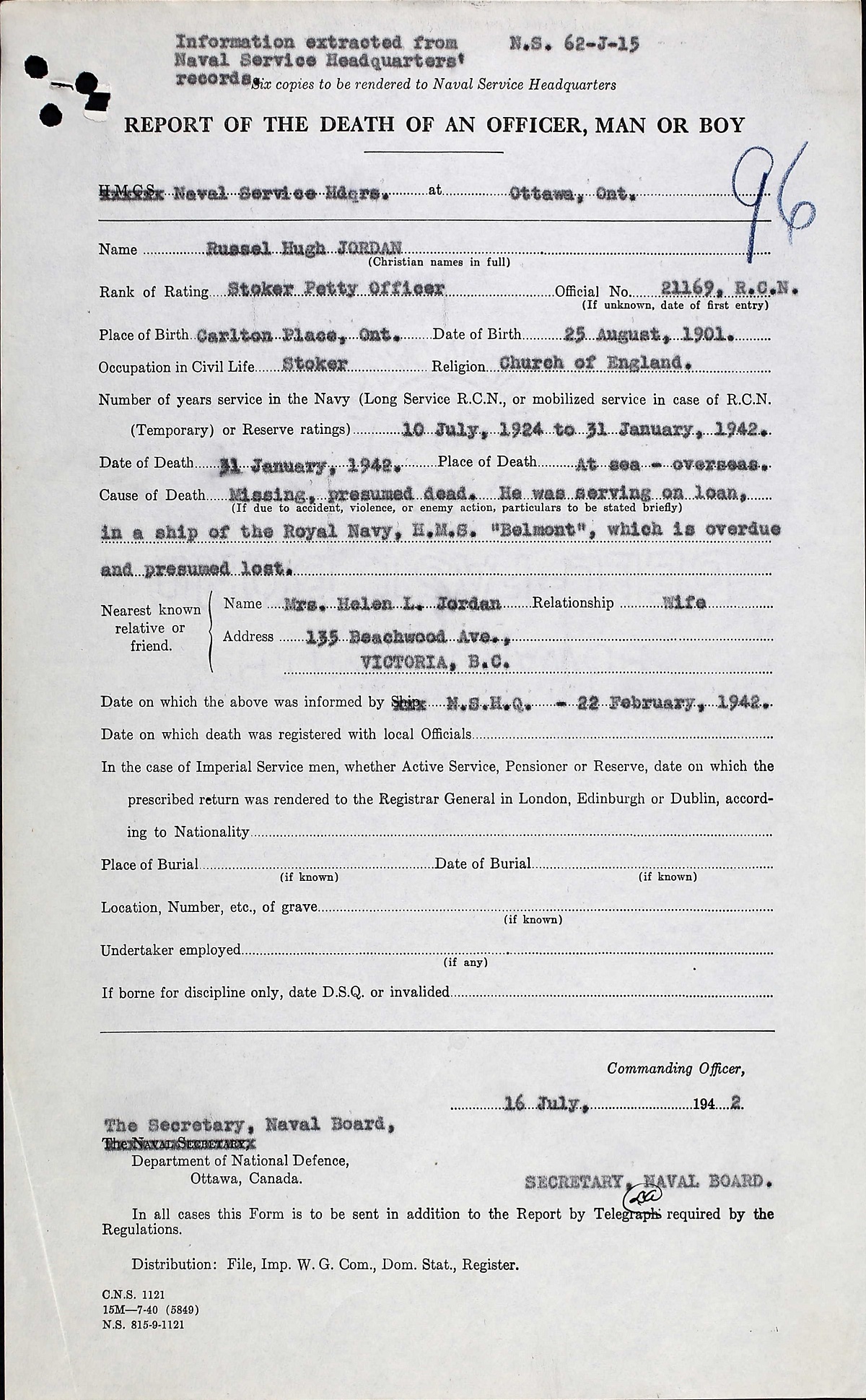 JORDAN, Russell Hugh, Stoker PO, 21169, RCN, MPK - 31 Jan 1942, HMS BELMONT - Son of David Albert and Jessie P. Jordan; husband of Helen L. Jordan, Victoria, BC.