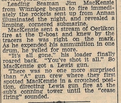 LS James MacKenzie was serving in HMCS ANNAN when she sunk U-1006 on 16 Oct 1944. Sometime after the action, Jim returned home suffering from what we now call PTSD. He never returned back to ship.