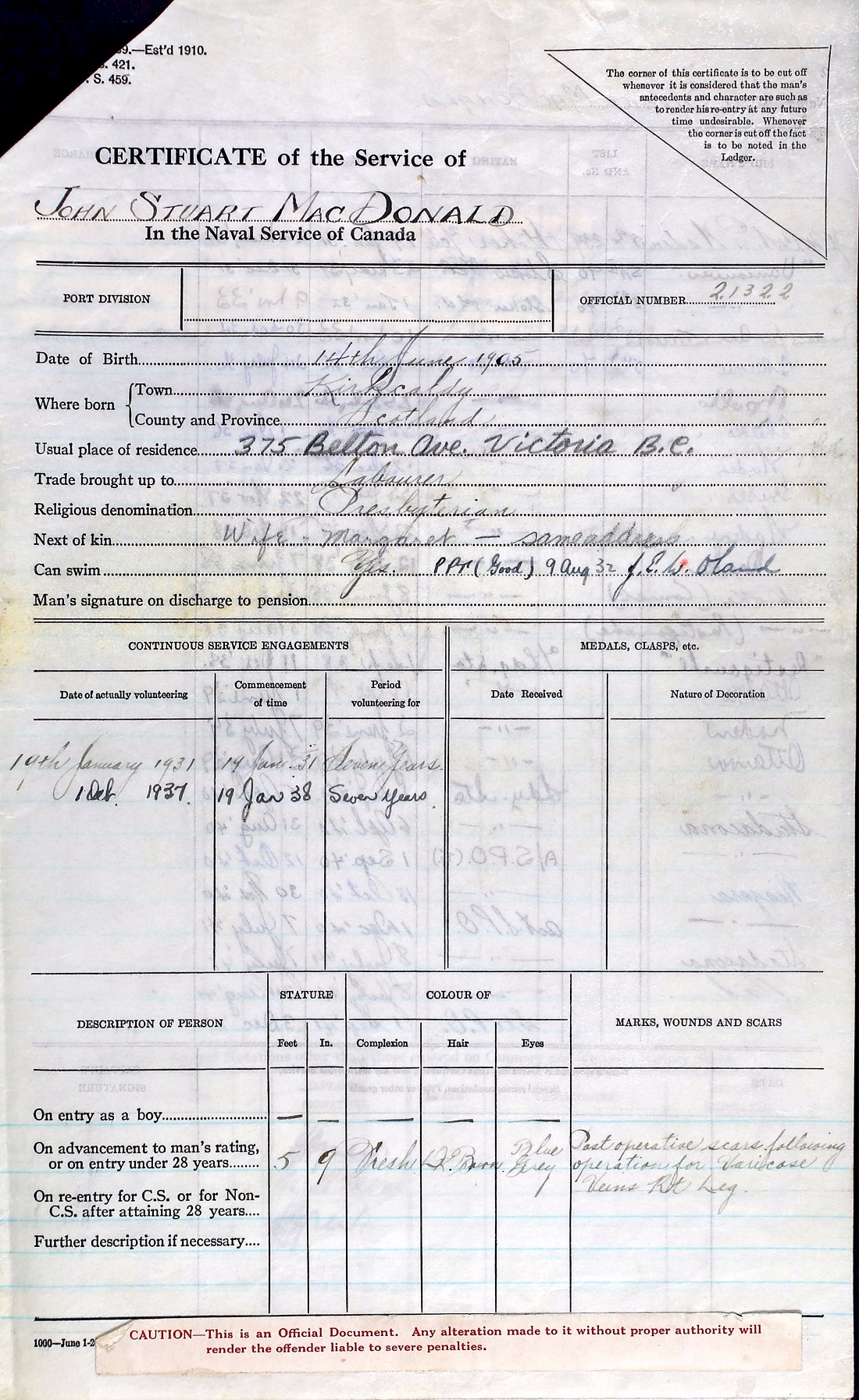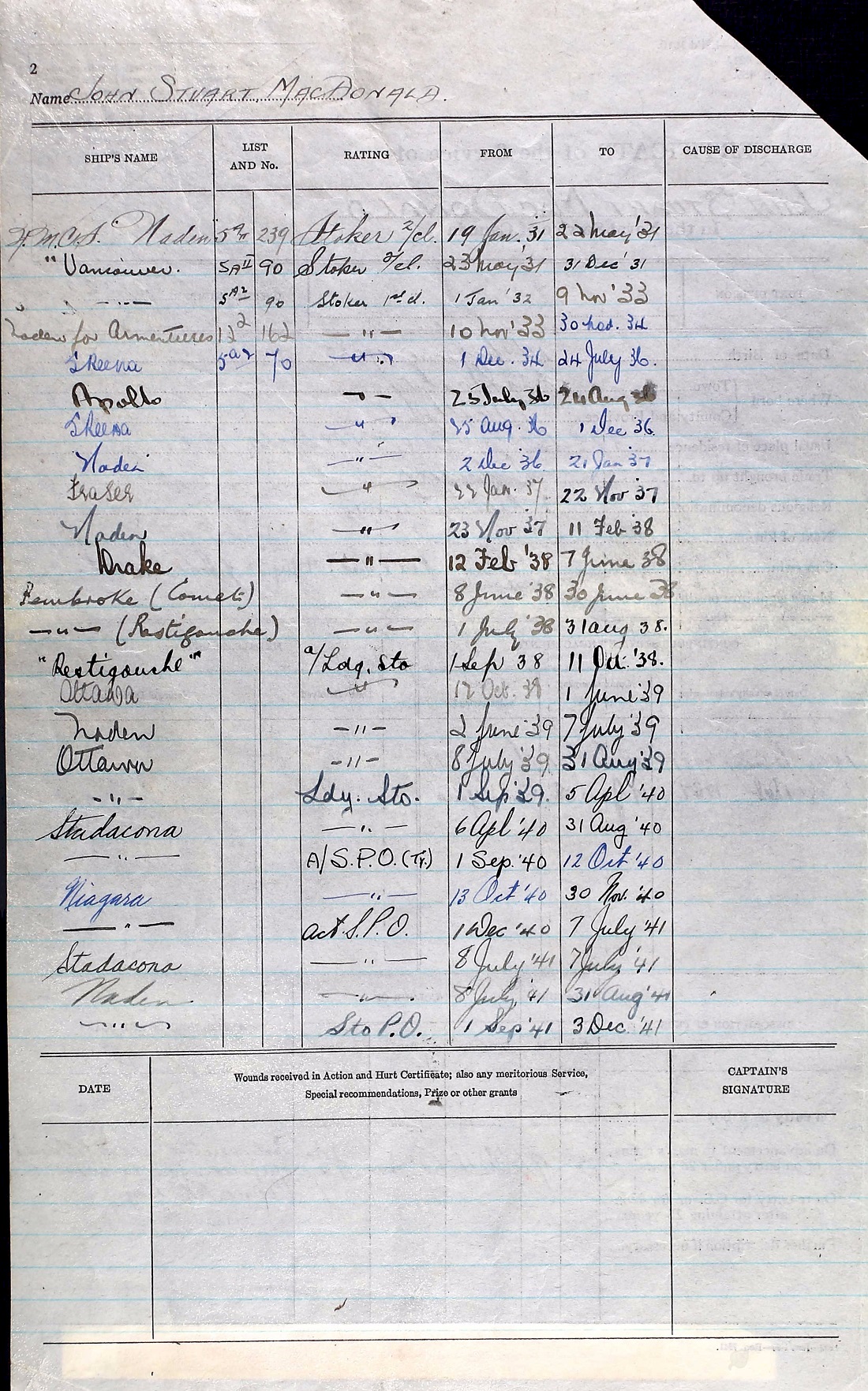 Ships served in: HMCS VANCOUVER - Served in VANCOUVER 23 May 1931 - 09 Nov 1933 as a Sto 2c & Sto 1c, RCN HMCS ARMENTIERES - Served in ARMENTIÈRES 10 Nov 1933 - 30 Nov 1934 as a Sto 1c, RCN HMCS SKEENA - Served in SKEENA 01 Dec 1934 - 24 Jul 1936 & 25 Aug 1936 - 01 Dec 1936 as a Sto 1c, RCN HMS APOLLO HMCS FRASER - Served in FRASER 22 Jan 1937 - 22 Nov 1937 as a Sto 1c, RCN HMS COMET / HMCS RESTIGOUCHE - Served in COMET 08 Jun 1938 - 30 Jun 1938. Served in RESTIGOUCHE 01 Jul 1938 - 11 Oct 1938 as a Sto 1c and A/L/Sto, RCN HMCS OTTAWA - Served in OTTAWA 12 Oct 1938 - 01 Jun 1939 and 08 Jul 1939 - 05 Apr 1940 as a A/L/Sto and L/Sto, RCN HMCS QUATSINO - Served in QUATSINO 05 De 1941 - 11 Jan 1942 as a Sto PO, RCN HMS BELMONT - Drafted to BELMONT 25 Jan 1942 as a Sto PO, RCN