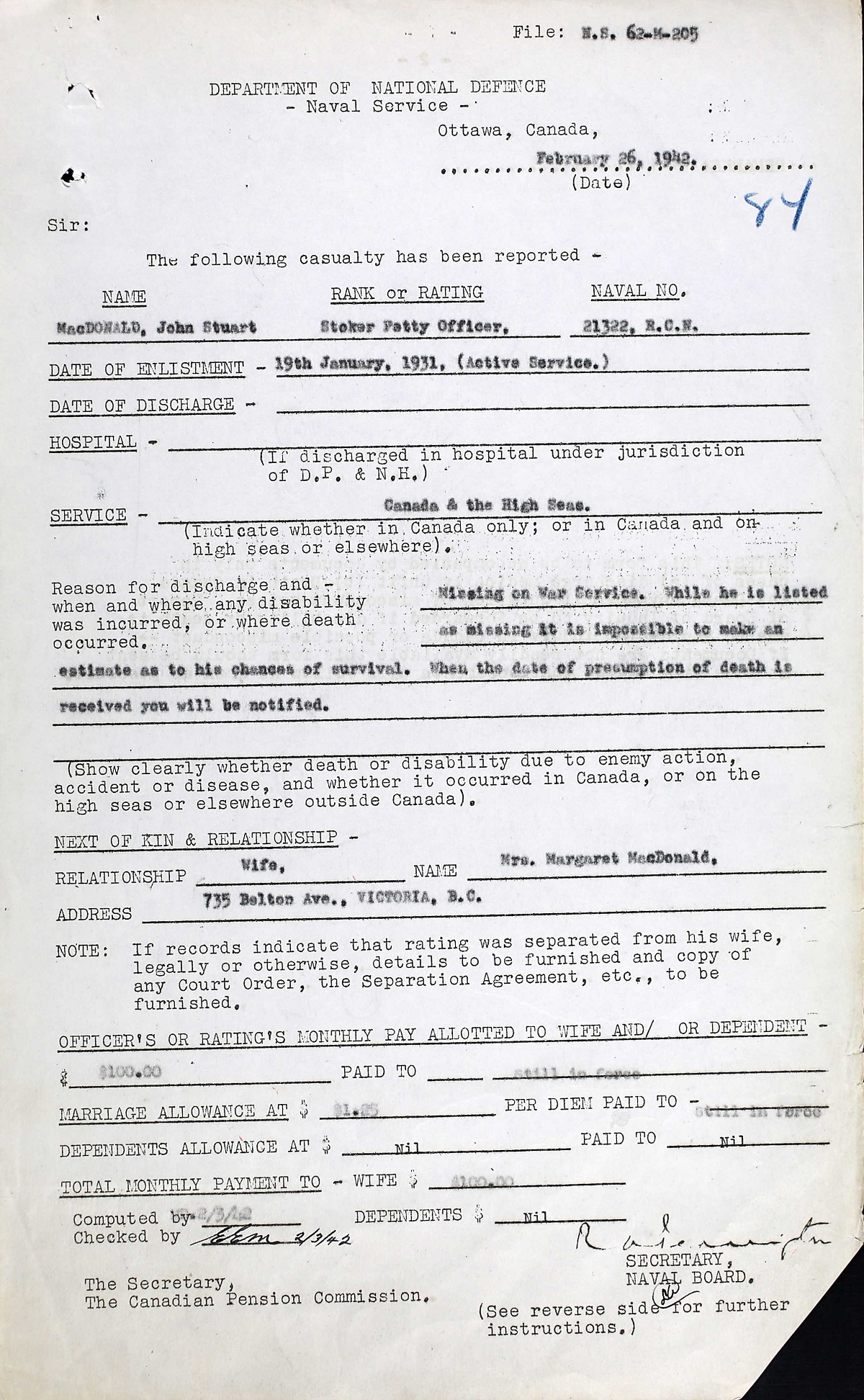 Obituary: MacDONALD, John Stuart, Stoker Petty Officer, 21322, RCN, MPK - 31 Jan 1942, HMS BELMONT - Son of David and Jean MacDonald, Kirkcaldy, Fife, Scotland; husband of Margaret Alice MacDonald, Victoria, BC.