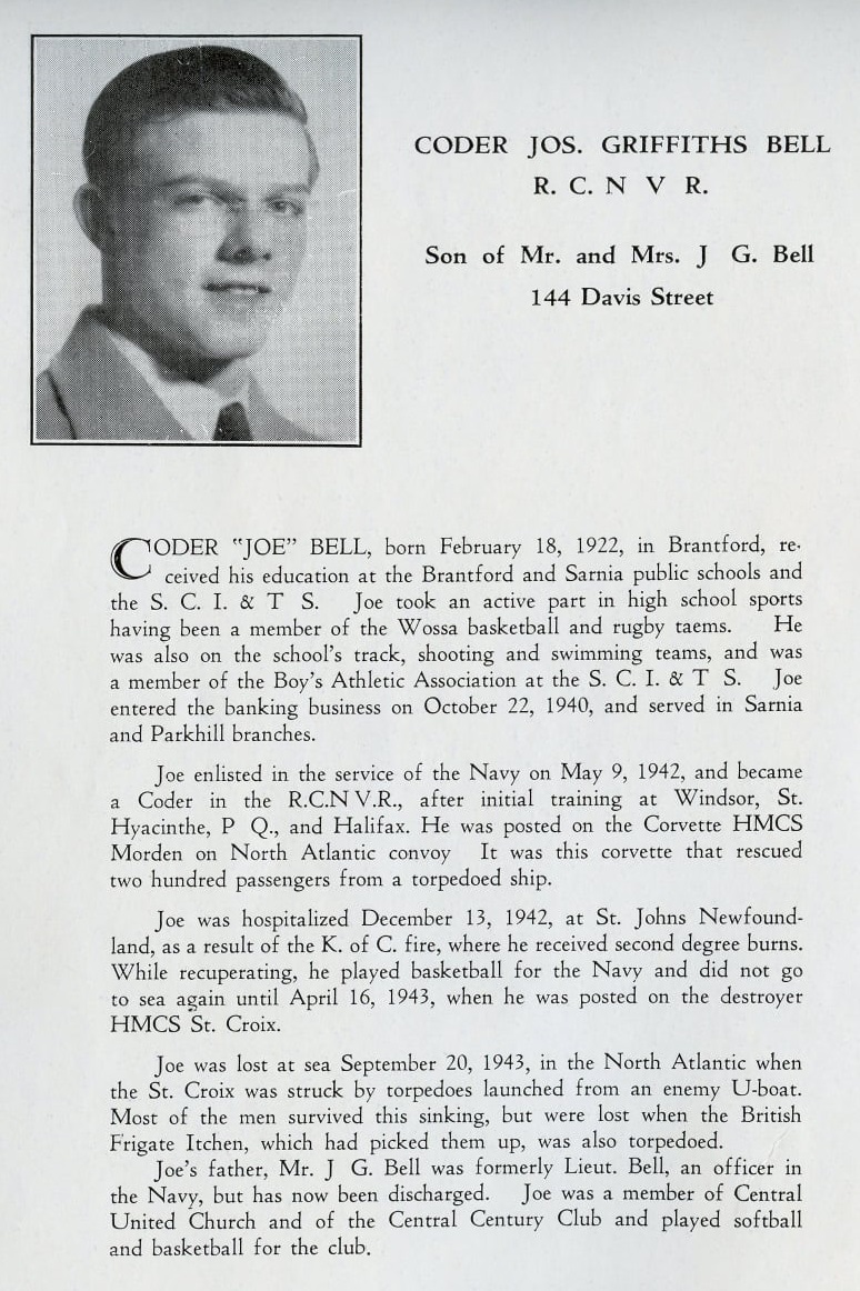 BELL, Joseph Griffiths, Coder, V35750, RCNVR, killed - 20 Sep 1943, HMCS ST CROIX - Son of Joseph G. and Edith Laura Bell of Sarnia, Ontario.