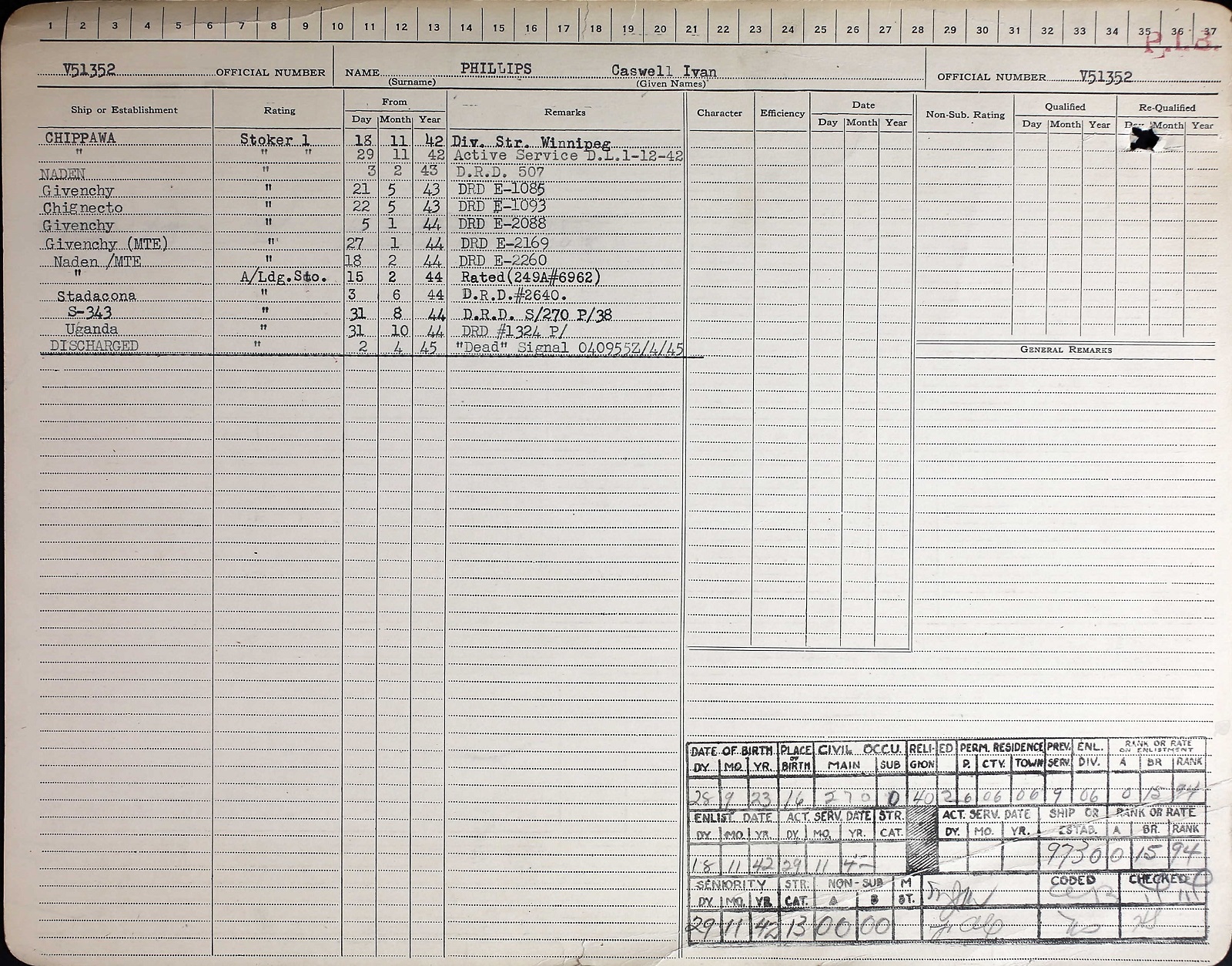 Ships served in: HMCS CHIPPAWA - Enlisted 18 Nov 1942. Commenced Active Service 29 Nov 1942 HMCS GIVENCHY - Served in GIVENCHY 21 May 1943 as a Sto 1c, RCNVR HMCS CHIGNECTO - Served in CHIGNECTO 22 May 1943 - 04 Jan 1944 as a Sto 1c, RCNVR HMS UGANDA - Drafted to HMS UGANDA 31 Aug 1944 as an A/L/Sto, RCNVR HMCS UGANDA - RCN Commissioning crew 31 Oct 1944