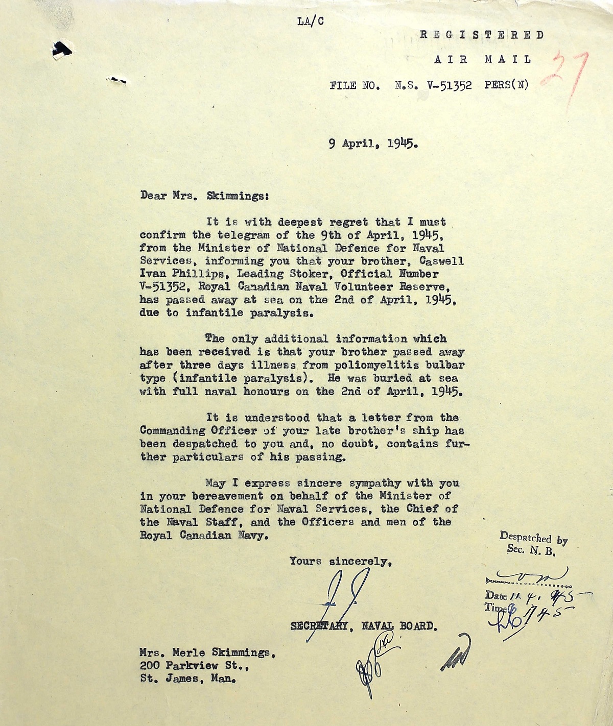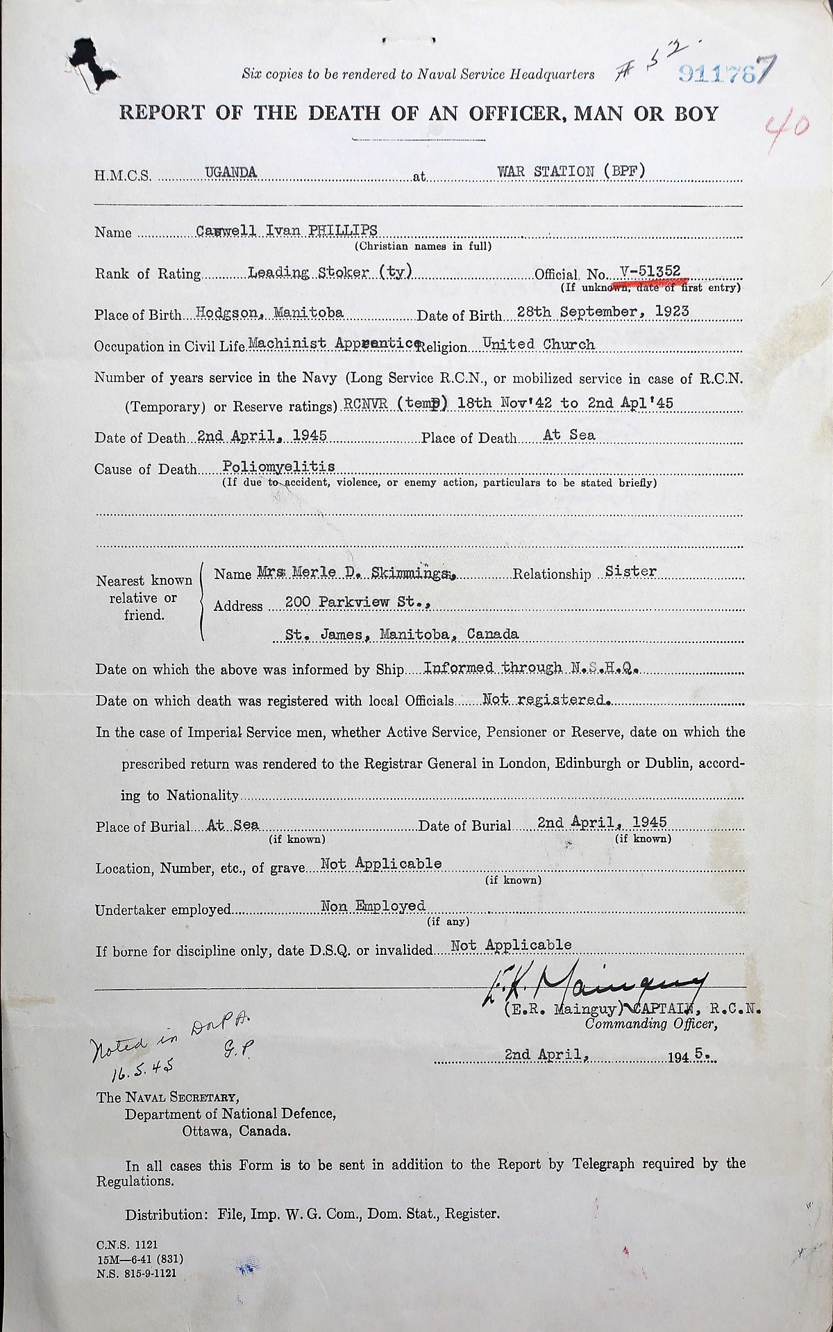 Leading Stoker C. I. Phillips died at sea aboard HMCS UGANDA due to poliomyelitis bulbar (infantile paralysis). He was buried at sea.