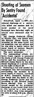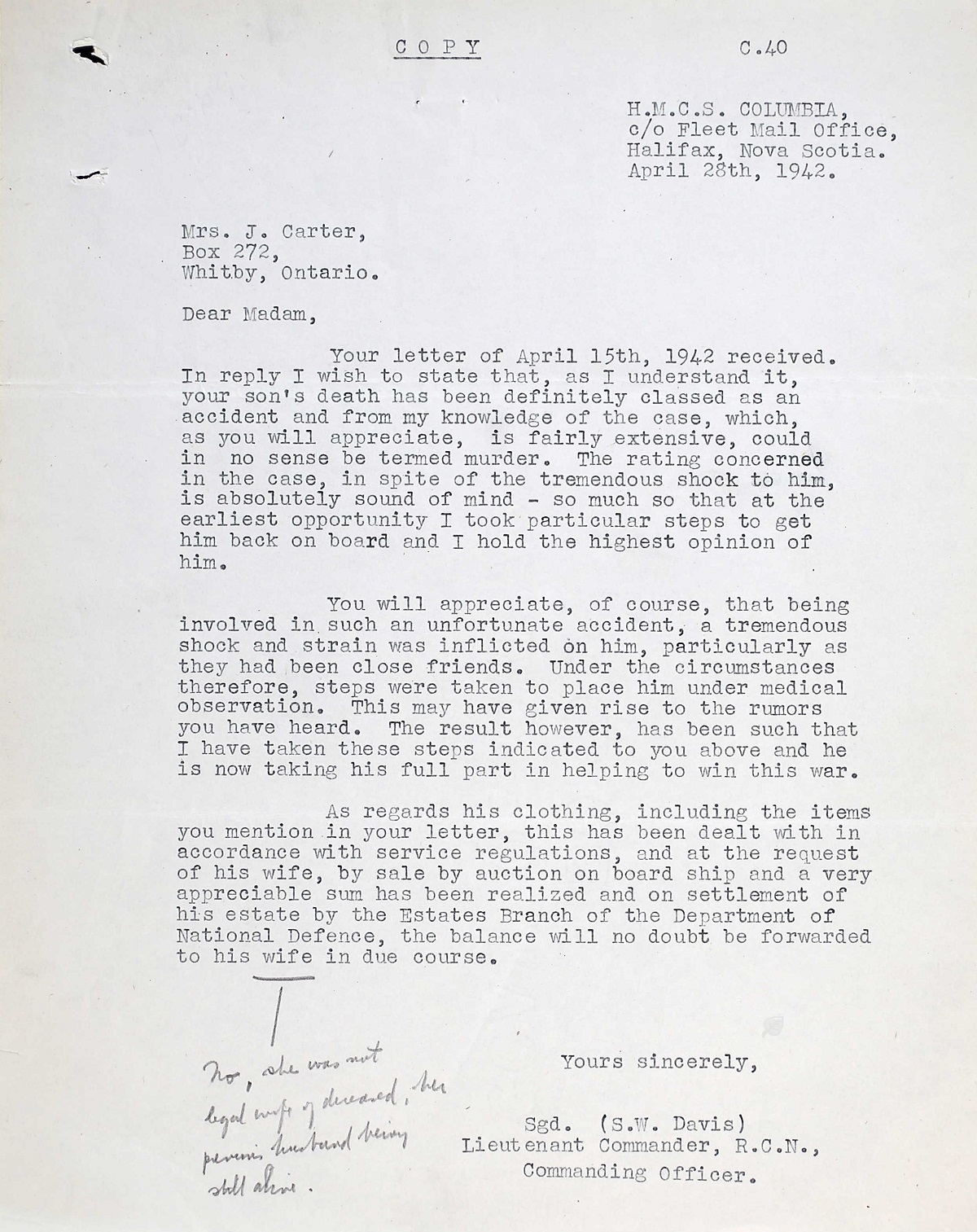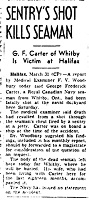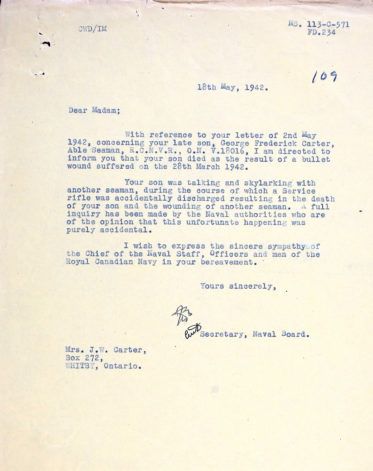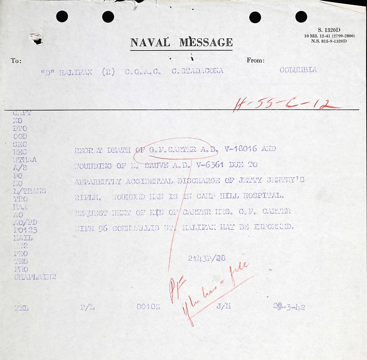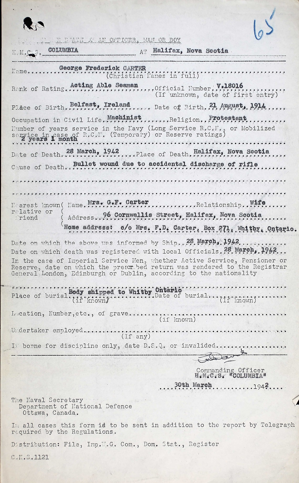 Able Seaman G. F. Carter died at Halifax Harbour, Halifax, Nova Scotia from a bullet wound due to accidental discharge of a rifle. Able Seaman Carter was standing near the gangway of HMCS COLUMBIA, which was tied alongside jetty No. 4. In the course of some innocent scuffling, a loaded rifle was accidentally discharged, resulting in the death of Able Seaman Carter and the wounding of another seaman. He is buried in the St. John's Cemetery, Port Whitby, Ontario.