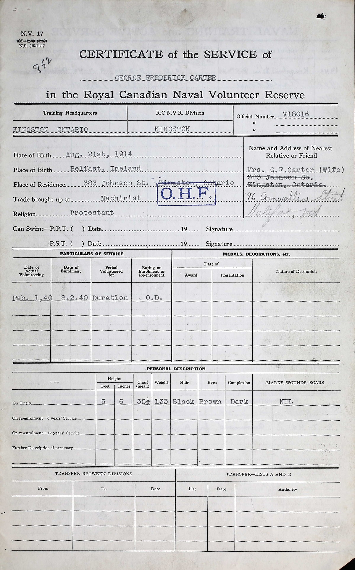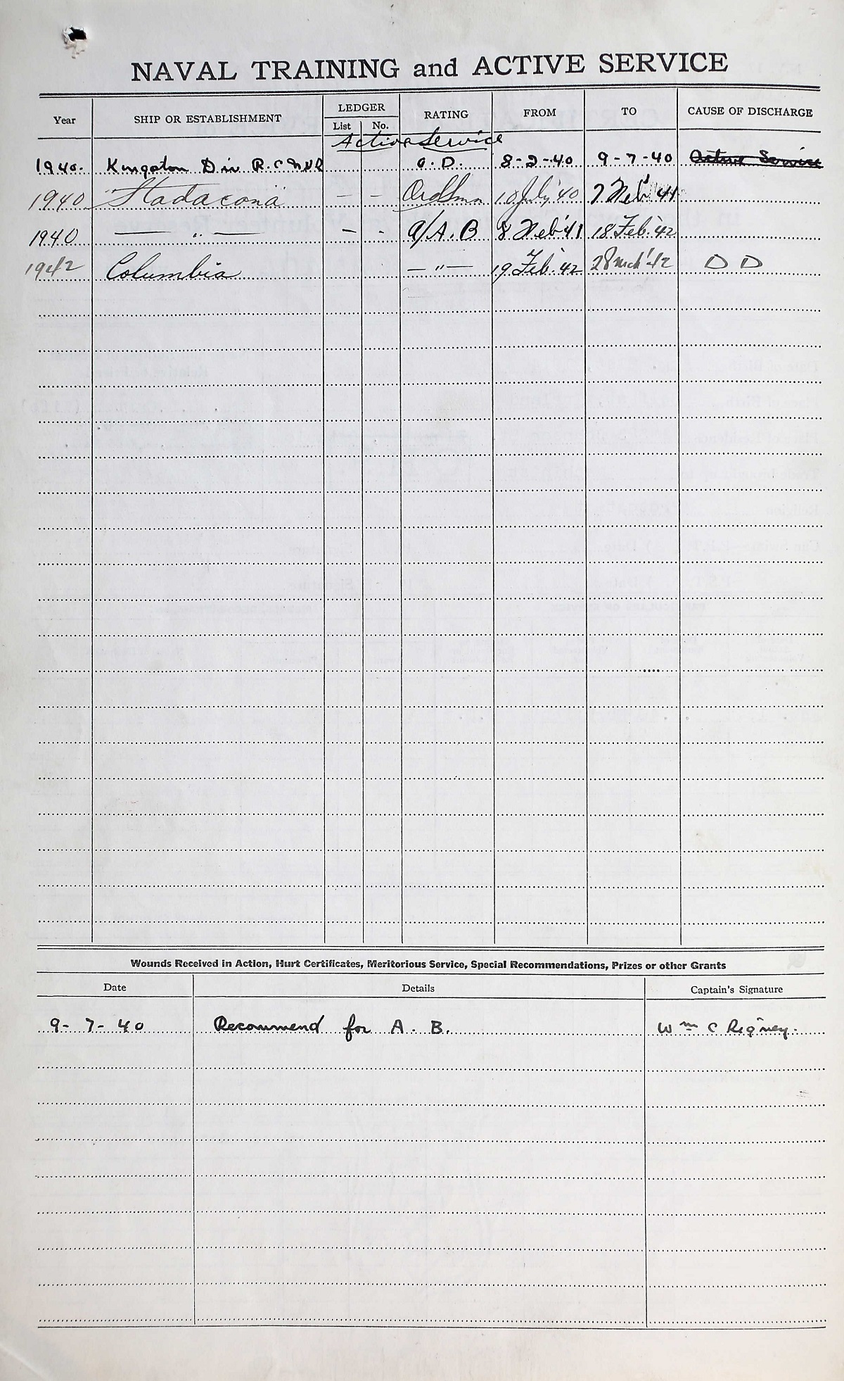 Ships served in: KINGSTON DIVISION RCNVR - Enlisted 08 Feb 1940. Commenced Active Service 08 Feb 1940 HMCS COLUMBIA - Drafted to COLUMBIA 19 Feb 1942 as an A/AB, RCNVR