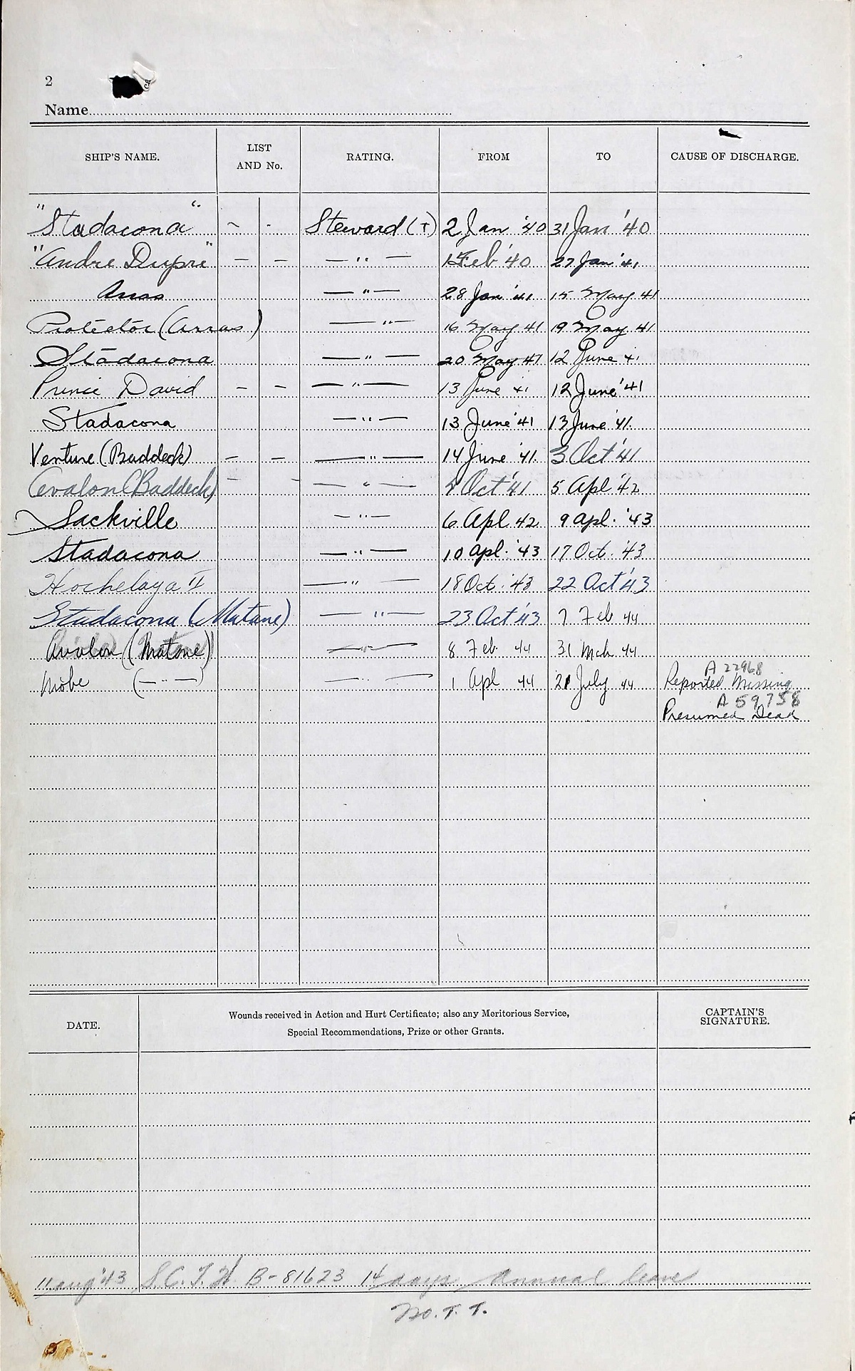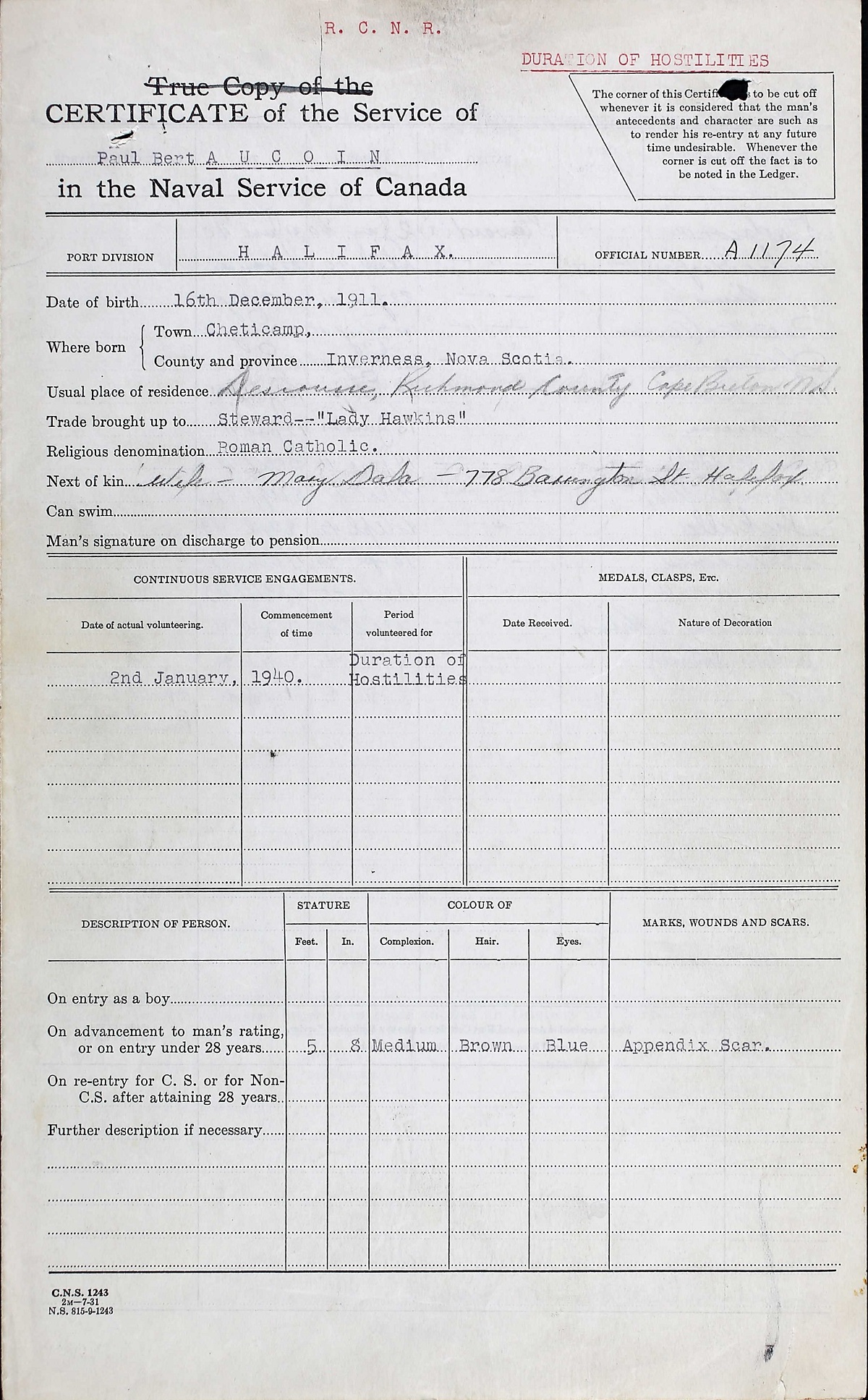 Ships served in: HMCS STADACONA - Enlisted 02 Jan 1940 as a Steward (T), RCNR HMCS ANDREE DUPRE - Served in ANDREE DUPRE 15 Feb 1940 - 27 Jan 1941 as a Stwd (T), RCNR HMCS ARRAS - Served in ARRAS 29 Jan 1941 - 19 May 1941 as a Stwd (T), RCNR HMCS BADDECK - Served in BADDECK 14 Jun 1941 - 05 Apr 1942 as a Stwd (T), RCNR HMCS SACKVILLE - Served in SACKVILLE 06 Apr 1942 - 09 Apr 1943 as a Stwd (T), RCNR HMCS MATANE - Drafted to MATANE 23 Oct 1943 as a Stwd (T), RCNR