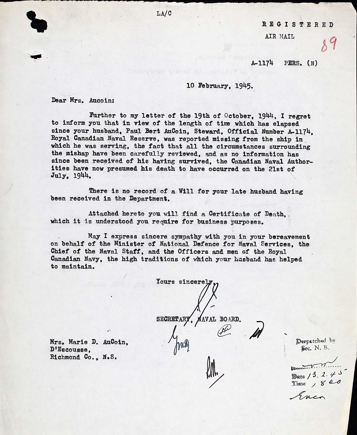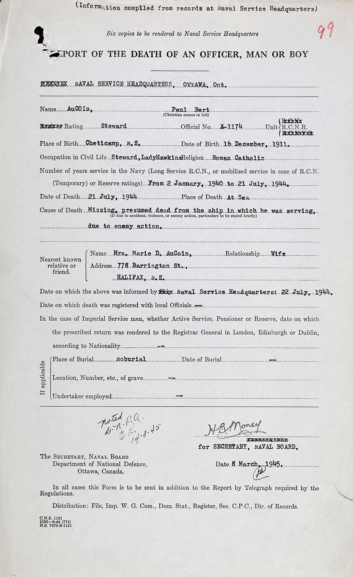 AUCOIN, Paul Bert Stwd, A1174, RCNR, MPK - 21 Jul 1944, HMCS MATANE - Son of Lubin B. and Catherine Aucoin, of Plateau, Nova Scotia. Husband of Marie D. Aucoin, of Halifax, Nova Scotia.