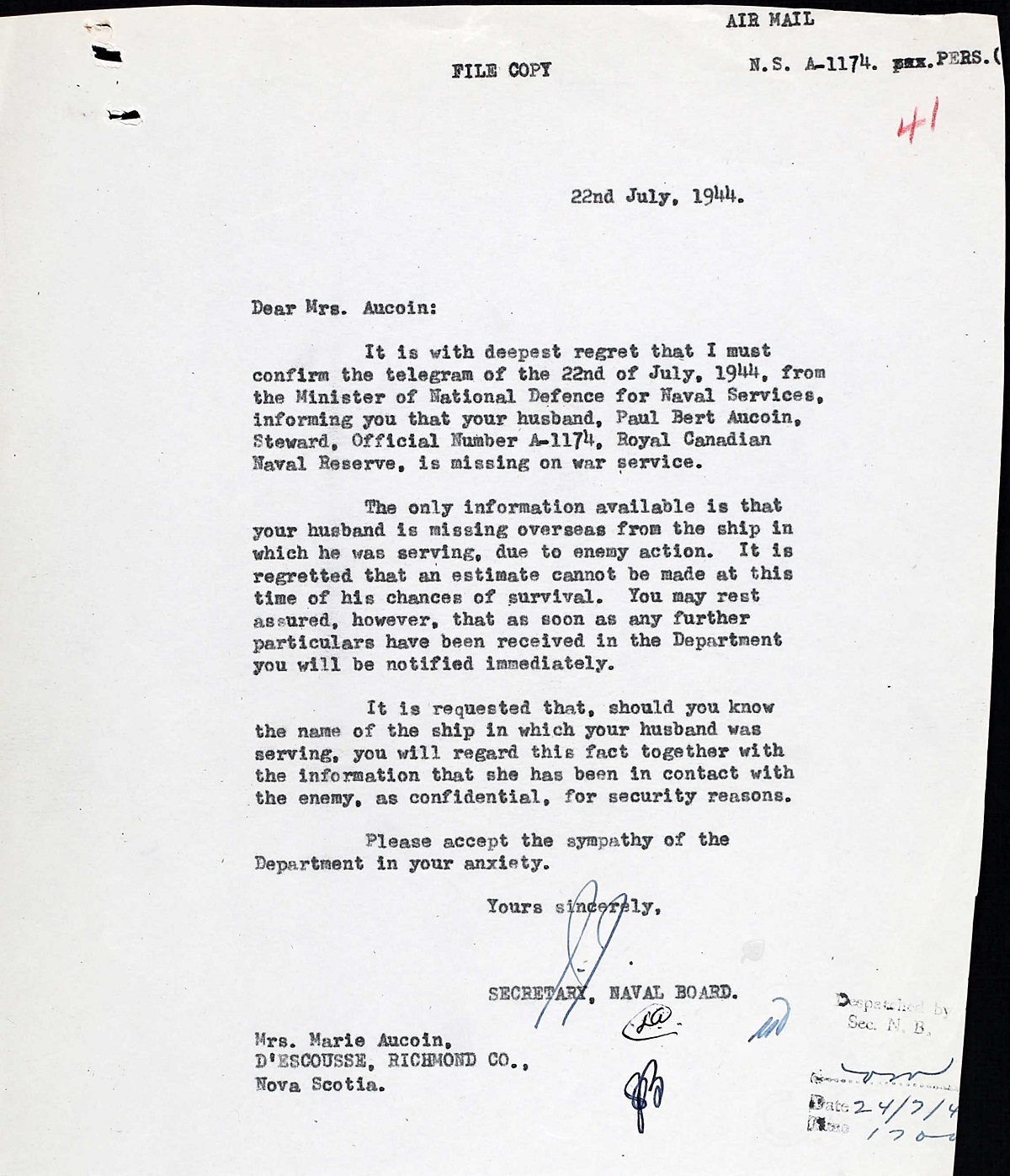 Steward P. B. Aucoin was one of four members of the crew of HMCS MATANE who were killed when the frigate was struck by a glider bomb, launched by a Dornier 217, in the Bay of Biscay, South of the Brest Peninsula on July 20, 1944.