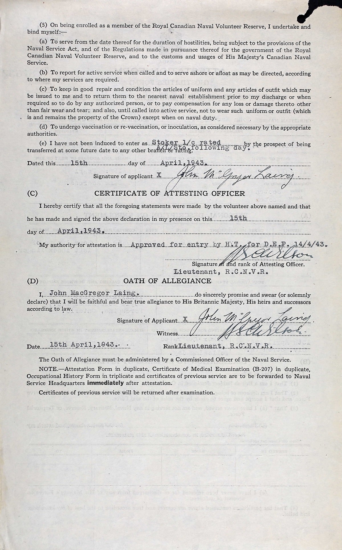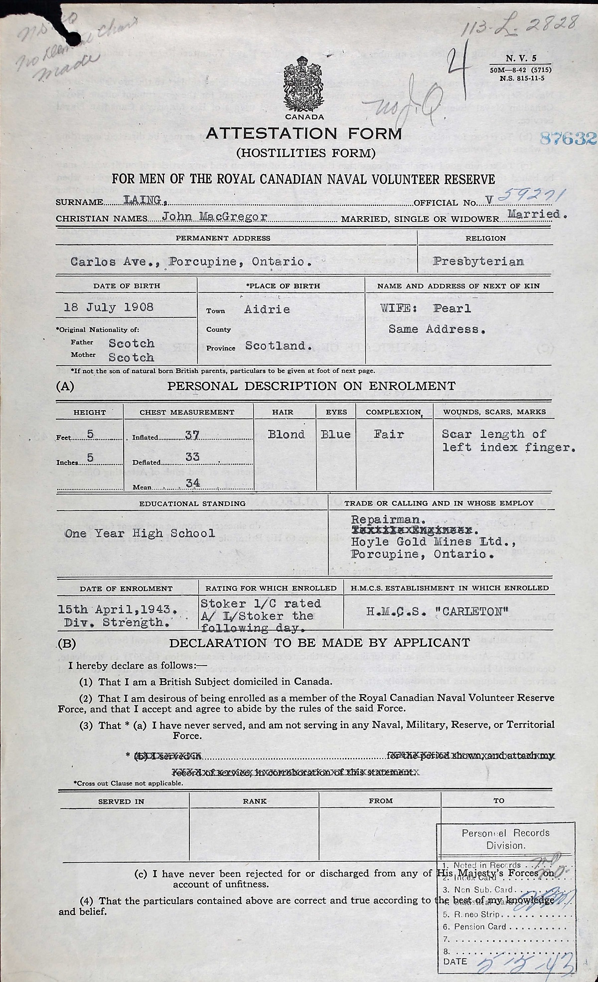 Ships served in: HMCS CARLETON - Enlisted 15 Apr 1943.