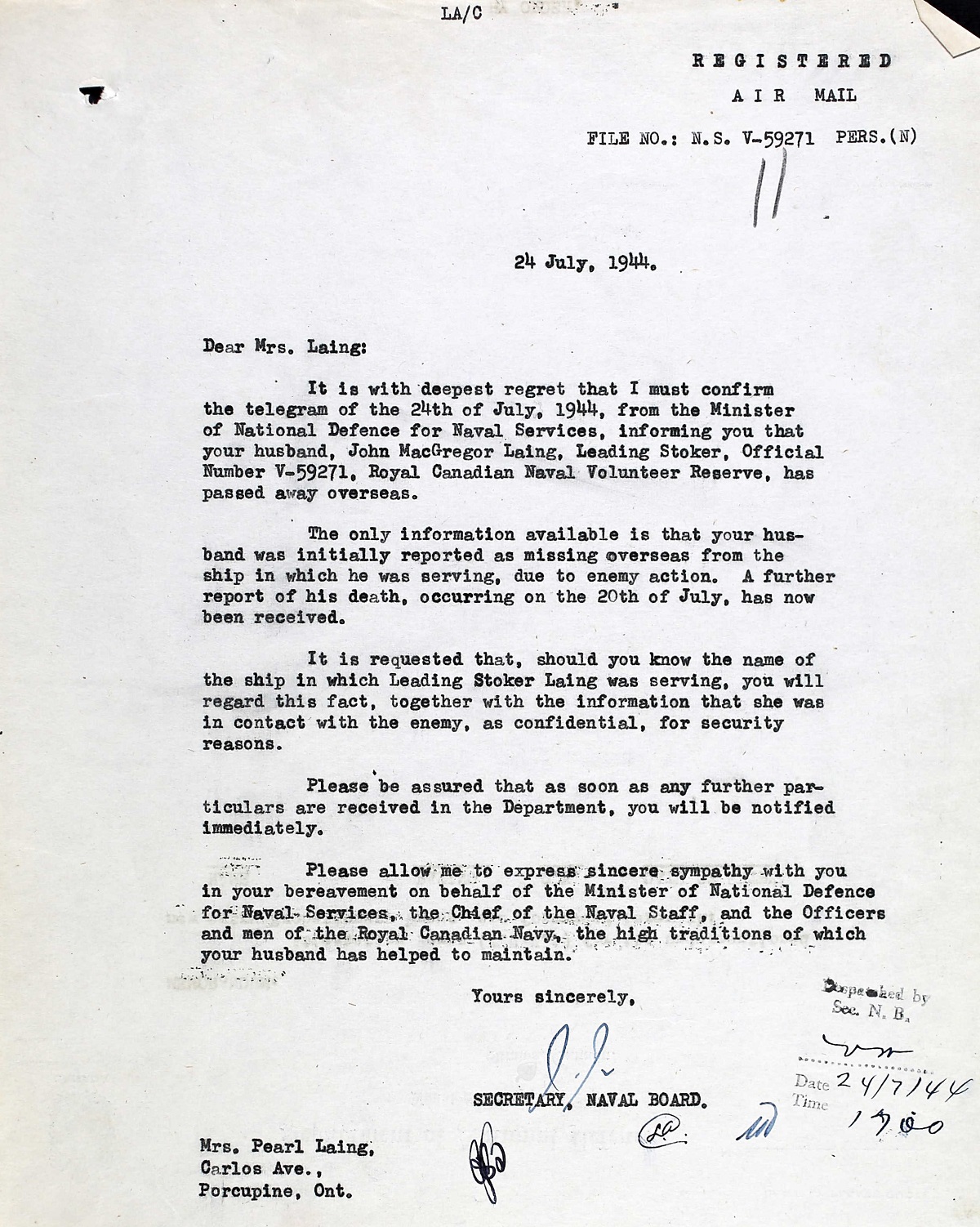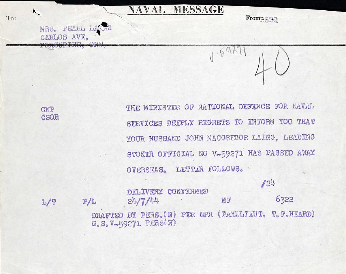 LAING, John McGregor, Leading Stoker, V59271, RCNVR, killed - 20 Jul 1944, HMCS MATANE - Son of William Winton and Annie Brown McGregor Laing; husband of Pearl Christina Laing, of South Porcupine, Ontario.