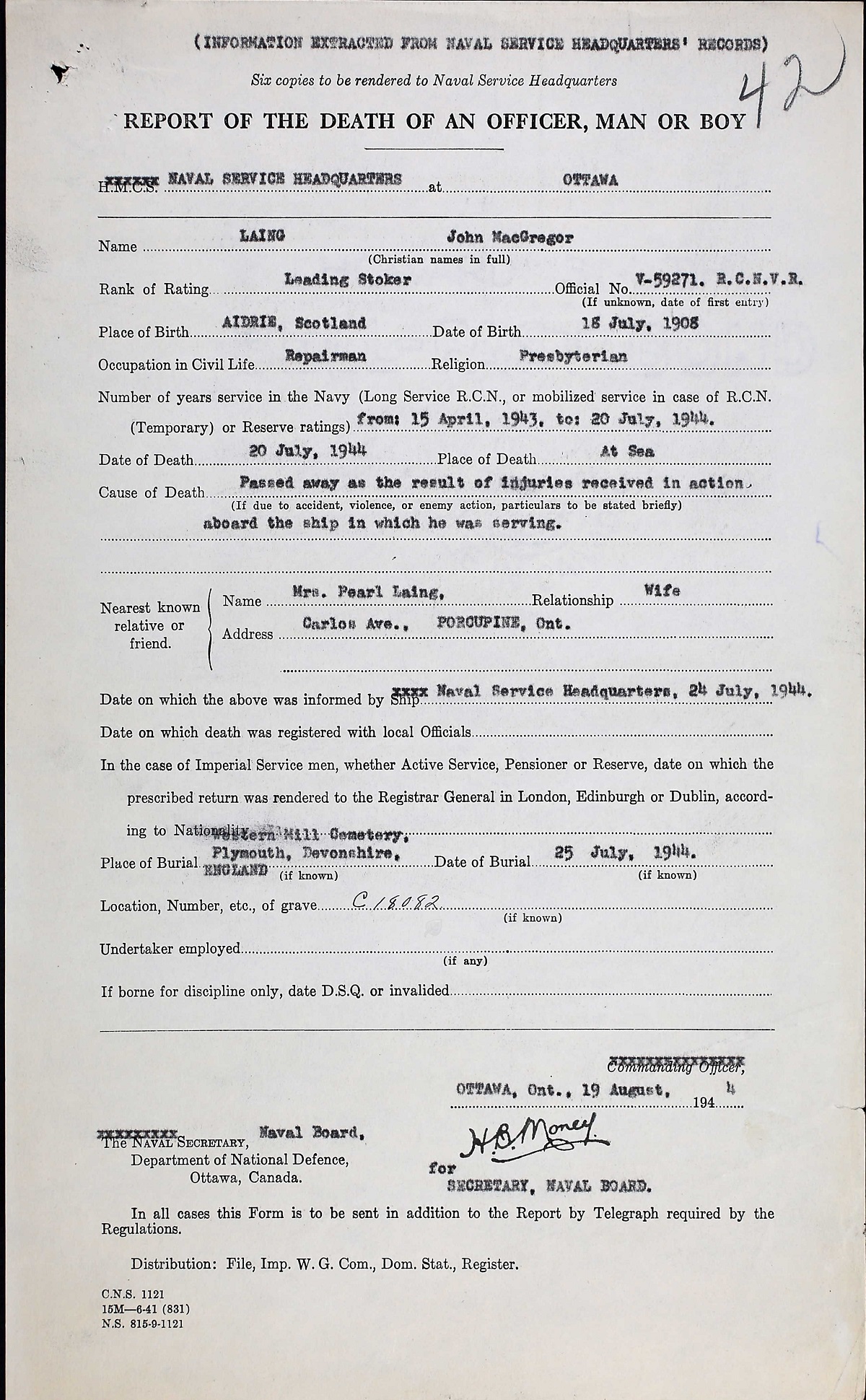 Leading stoker J. M. "Scotty" Laing died from injuries he received in action when HMCS MATANE was attacked with a glider bomb and damaged in United Kingdom waters. He is buried Weston Mill Cemetery, Plymouth, England.