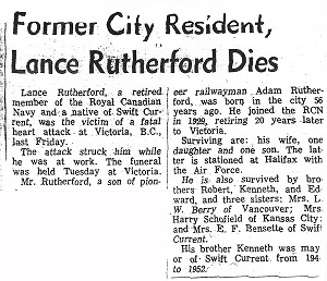 RUTHERFORD, Adam Lancelot (Lance) - In Victoria on Friday, November 12, 1965, Adam Lancelot Rutherford. He was born in Swift Current, Saskatchewan and had been a resident of Victoria for 35 years. He leaves his wife, Norma; a daughter, Mrs. T. A. (Donna) Hetherington of Victoria; two sons, Lance William of Downsview, Ontario, and Denis Wayne of Victoria; three brothers and three sisters and two granddaughters. Funeral arrangements will be announced later by Chaplain's Funeral Chapel. (The Victoria Times Colonist 15 Nov 1965)