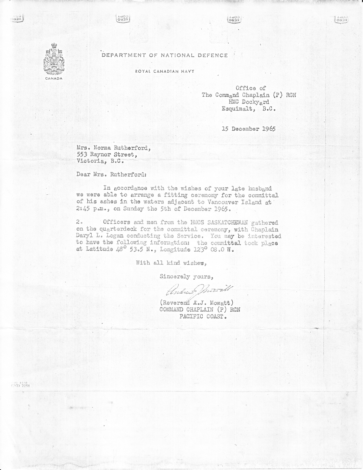 (AR00) Obituary for Lance Rutherford (AR01) Letter to Lance's widow on his burial at sea