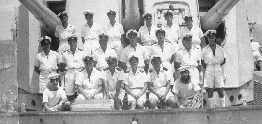 (AR09) HMCS UGANDA Gunnery Branch Officers, Chiefs and Petty Officers Wallace Mofford - Back Row, 1st on left Lance Rutherford - Middle Row, 1st on left