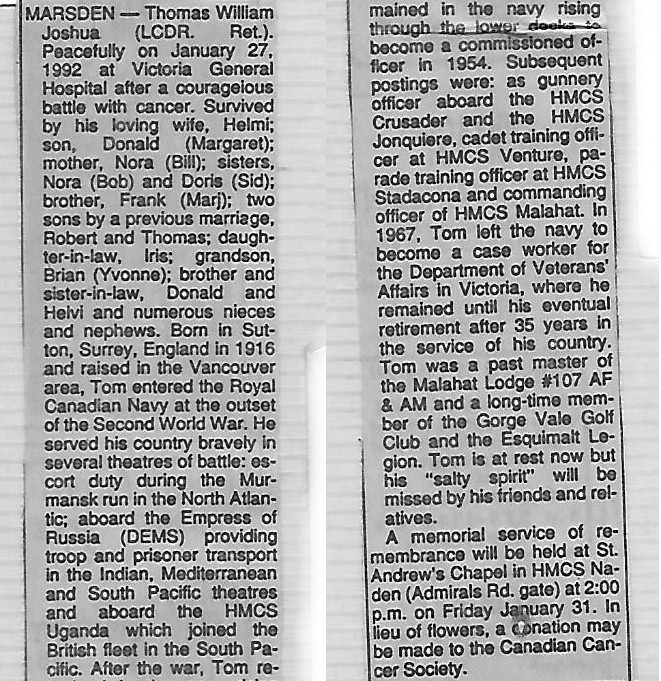 PO Thomas Marsden is mentioned the press release below as part of the burial party for the burial at sea of PO Joseph Dumont