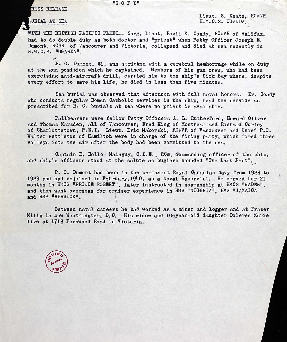 PO Richard Curley is mentioned the press release below as part of the burial party for the burial at sea of PO Joseph Dumont
