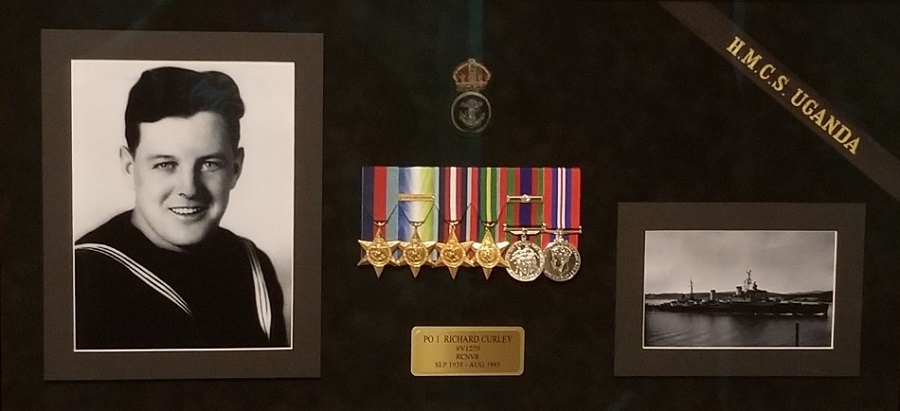 CURLEY, Richard John (Dick) - was born in 1913 in Charlottetown (West) Royalty, PEI, son of Patrick and Isabelle Curley. He enlisted in the Royal Canadian Navy Volunteer Reserve in 1940 and served in the North Atlantic on HMC Ships NIAGARA (1940-41), PRESCOTT (1941-42), and WETASKIWIN (1942-43). He was aboard HMS BELFAST in 1944, participating in the Normandy invasion, and on HMCS UGANDA in the South Pacific in fall of 1944 and 1945. Dick passed away in 1988.