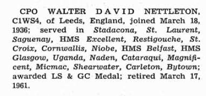 Retirement notice for CPO1 Walter Nettleton Crowsnest Magazine Apr 1961
