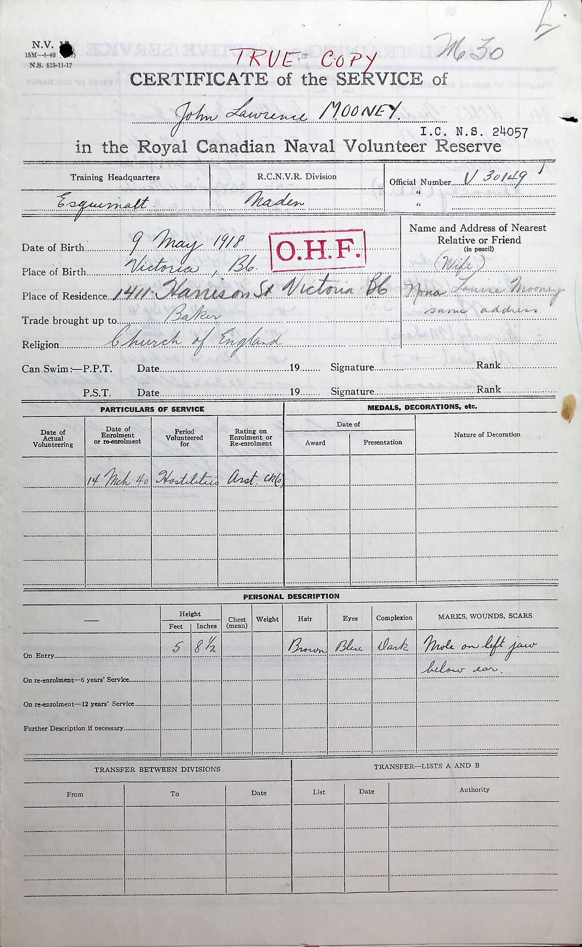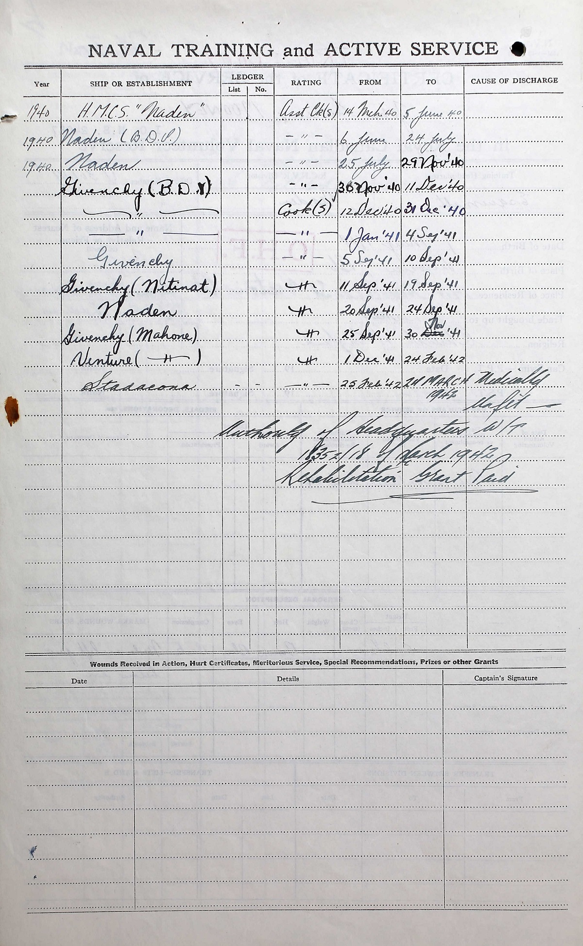 Ships served in: HMCS NADEN - Enlisted 14 Mar 1940 SARAVAN (HC96) - Served in SARAVAN 06 Jun 1940 - 24 Jul 1940 as a Cook (S), RCNVR HMCS GIVENCHY (for BOOM DEFENCE VESSEL) - Served in a BDV 30 Nov 1940 - 09 Sep 1941 as a Cook (S), RCNVR HMCS GIVENCHY - Served in GIVENCHY 05 Sep 1941 - 10 Sep 1941 as a Cook (S), RCNVR HMCS NITINAT - Served in NITINAT 10 Sep 1941 - 30 Sep 1941 as a Cook (S), RCNVR HMCS MAHONE - Drafted to MAHONE 01 Oct 1941 as a Cook (S), RCNVR * Discharge 24 Mar 1942 medically unfit due to cancer
