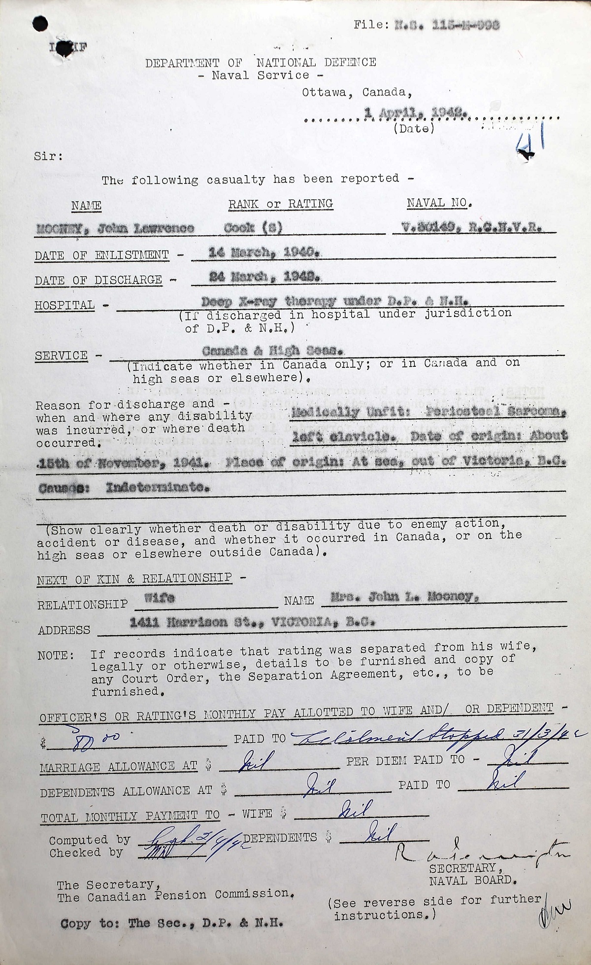 Cook (S) J. L. Mooney was discharged from the RCNVR 24 Mar 1942 as medically unfit due to cancer discovered while serving in HMCS MAHONE. He died at the Shaughnessy Hospital, Vancouver, British Columbia from osteogenic sarcoma of left clavicle (cancerous malignant bone tumor).