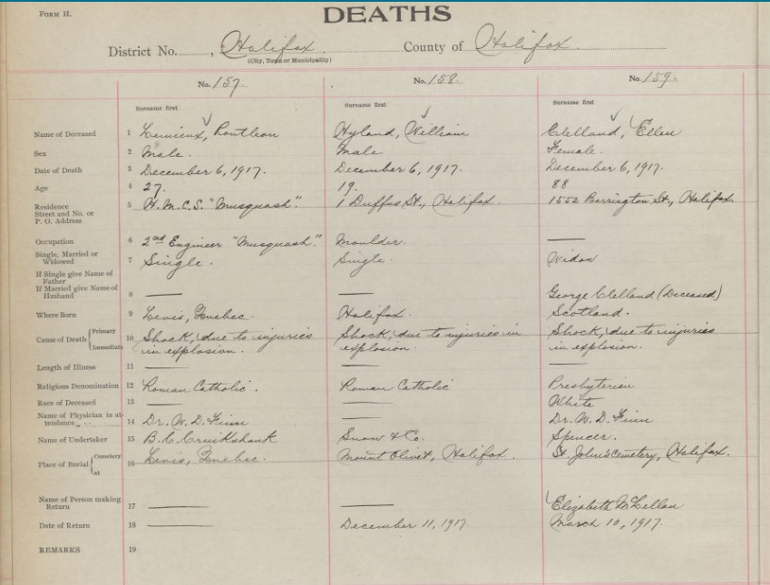 LEMIEUX, Philip Pantalion, CERA, RNCVR Killed - 06 Dec 1917, HMCS MUSQUASH - CERA Lemieux died as a result of injuries sustained in the Halifax Explosion. He is buried in the Mont Marie Cemetery, Levis, Quebec.