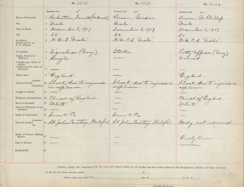 ROBERTSON, Donald, Signalman, VR1366, RNCVR, Killed - 06 Dec 1917, HMCS MUSQUASH. Signalman Robertson died as a result of injuries sustained in the Halifax Explosion. He is buried in the St. John's Cemetery, Halifax, NS.
