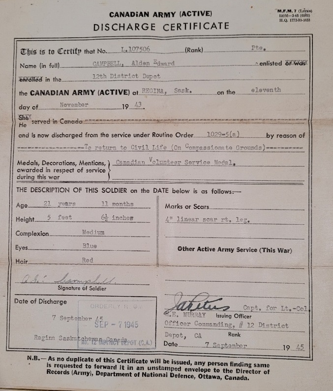 (AC01) Pte Alden Campbell (AC02) Alden's Discharge Certificate (AC03) RCAMC banner (AC04) Family photo