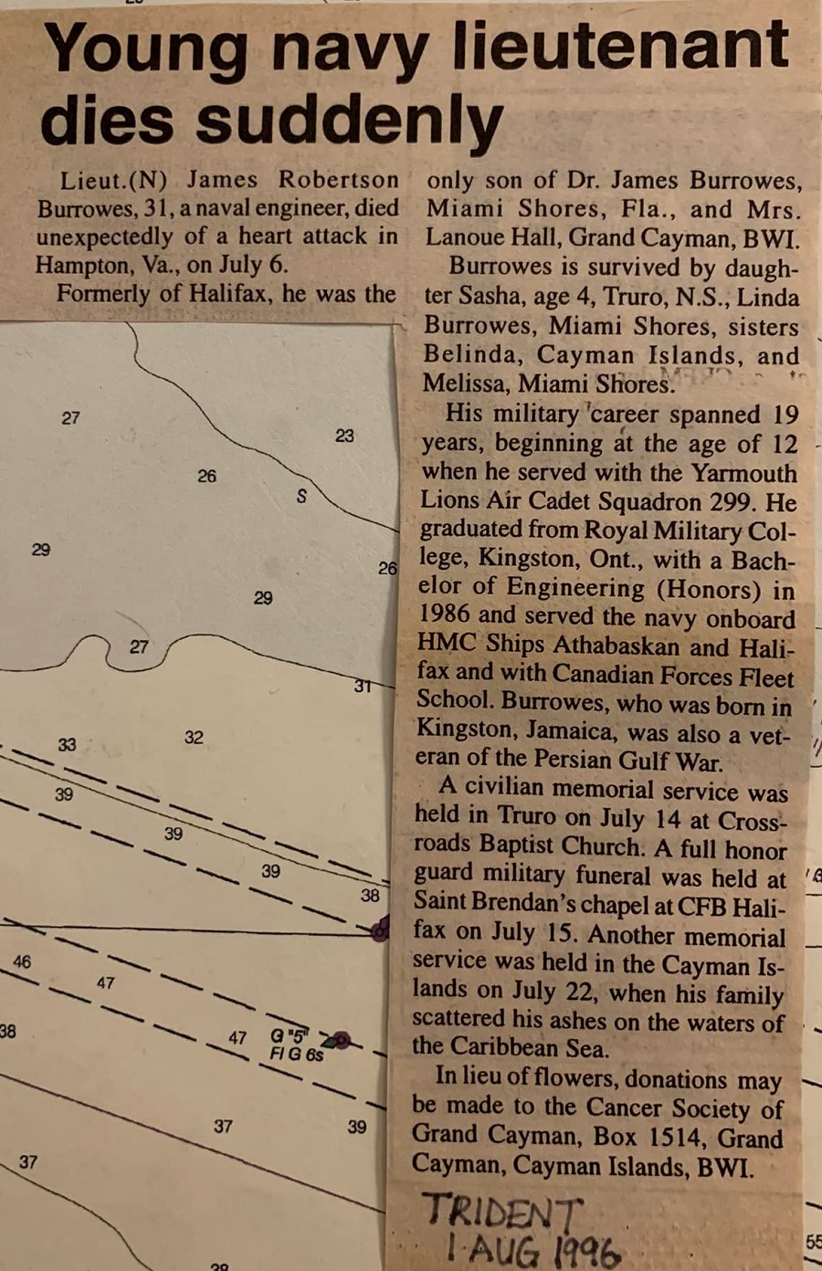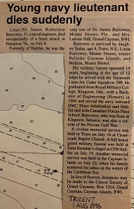(JB01) Lt (N) Rick Perks and Lt (N) James Burrowes (right) on HMCS ATHABASKAN 282 entering harbour at St. George's, Bermuda, Bermuda - Courtesy of Rick Perks (JB02) Article on the death of James Burrowes (Trident Magazine 01 Aug 1996) - Courtesy of Rick Perks