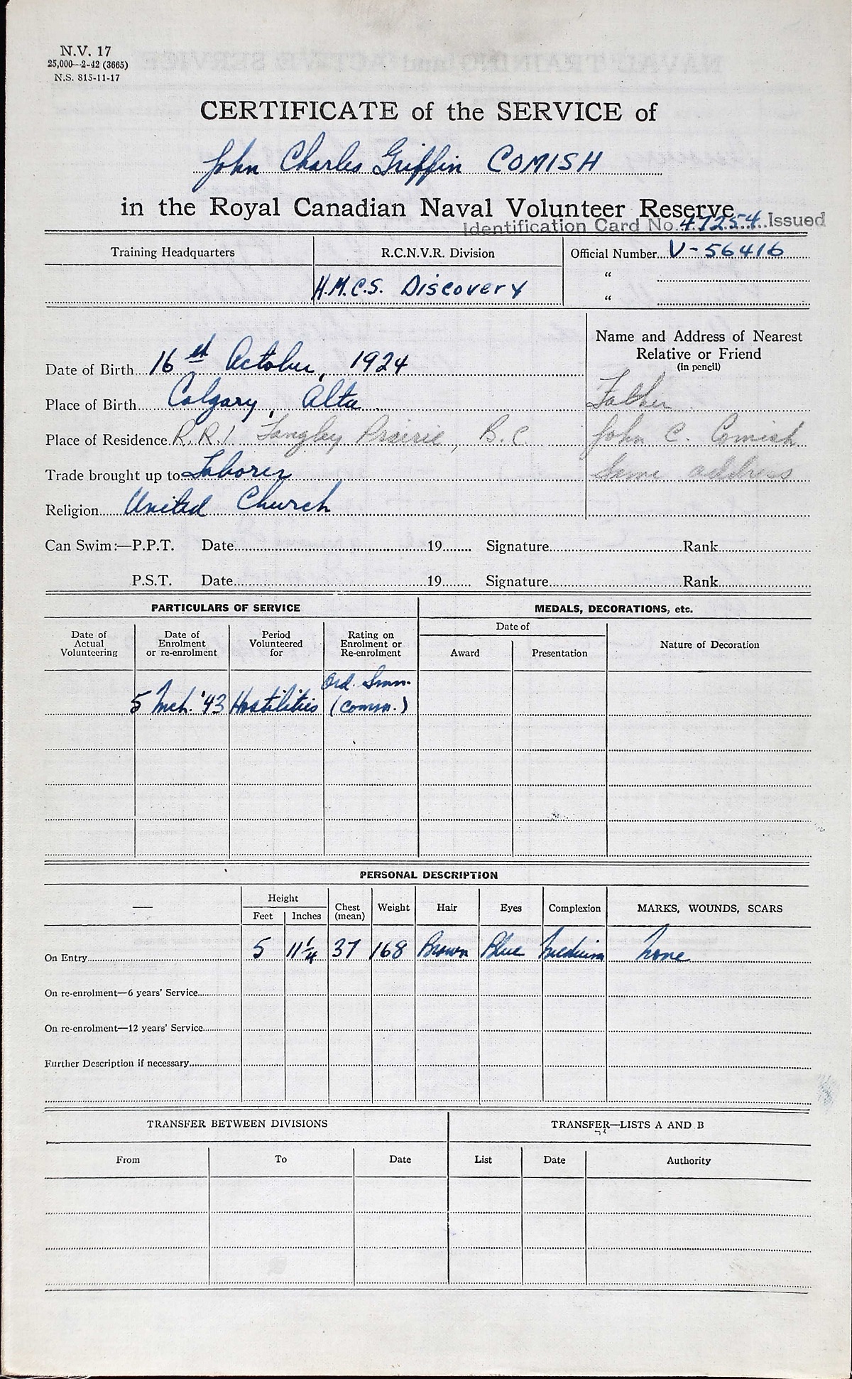 Telegraphist John Charles Griffon Comish, age 20 was the son of Mr. John Cicero Comish and the late Mrs. Ellaline Constance Comish of New Westminster. His wife the former Dorothy Harrow, also live in the Royal City, at 57 Elliott Street, New Westminster, B.C. He was educated in Langley Prairie and worked for Boeing Aircraft until he enlisted in 1942