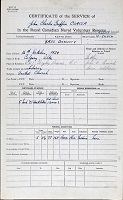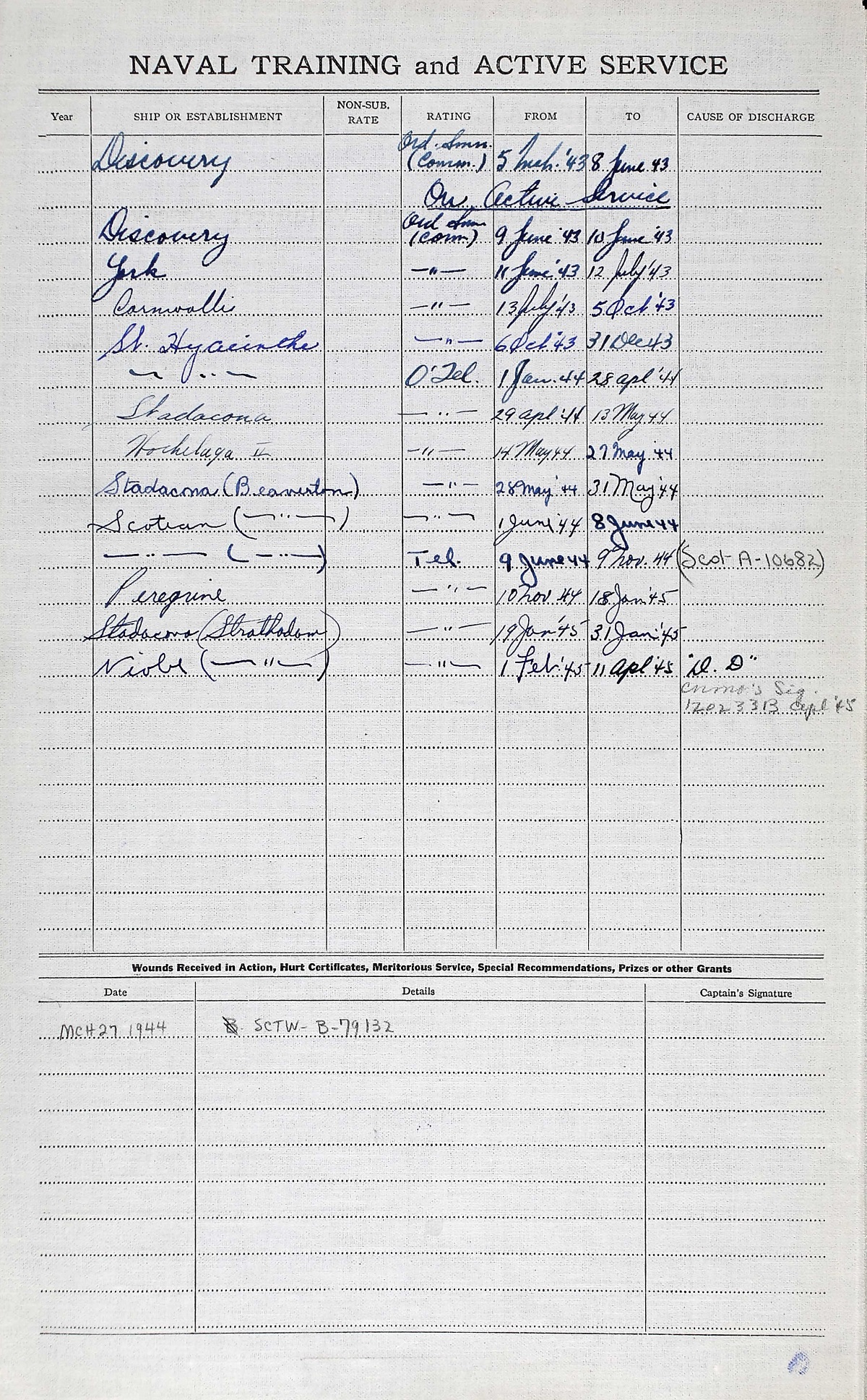 Ships served in: HMCS DISCOVERY - Enlisted 05 Mar 1943. Commenced Active Service 09 Jun 143 HMCS YORK - Served in YORK 11 Jun 1943 - 12 Jul 1943 as an OS, RCNVR HMCS BEAVERTON - Served in BEAVERTON 28 May 1944 - 09 Nov 1944 as an O/Tel and Tel, RCNVR. Rated Tel 09 Jun 1944 HMCS STRATHADAM - Drafted to STRATHADAM 19 Jan 1945 as a Tel, RCNVR