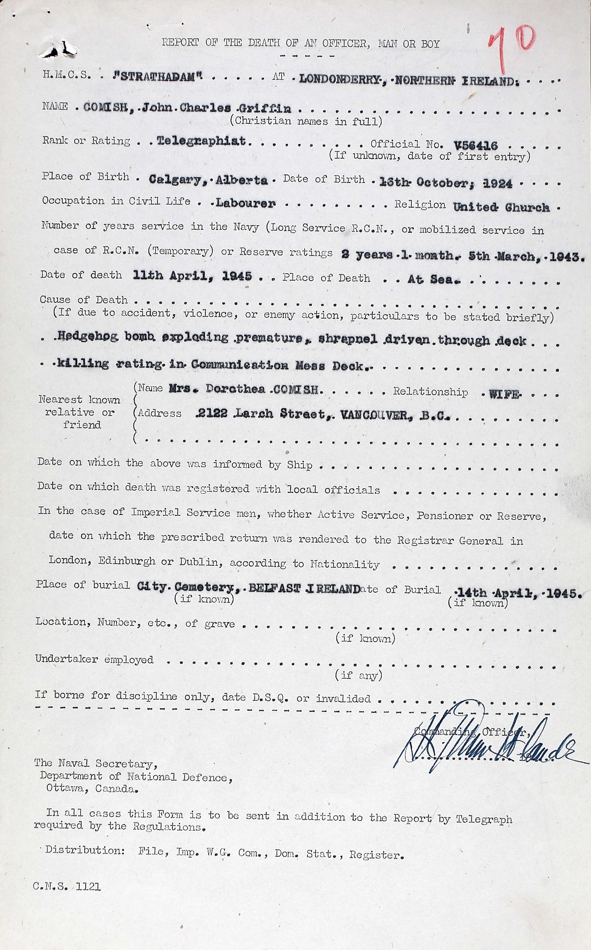 Telegraphist J. C. G. Comish was one of six members of the crew of HMCS STRATHADAM killed by a premature Hedgehog explosion on board the frigate during an attack on a suspected submarine. He is buried in the Belfast City Cemetery, Belfast, Northern Ireland.