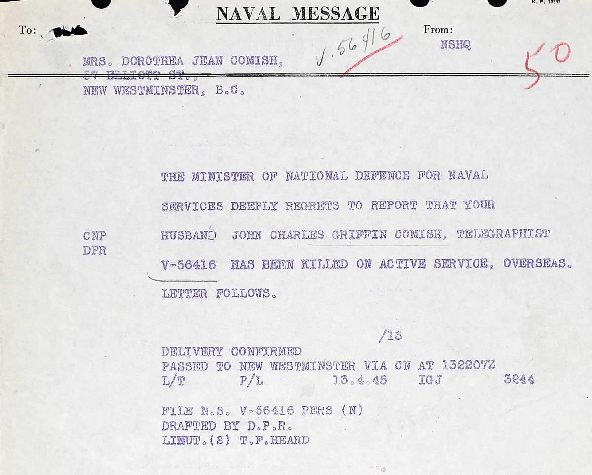 COMISH, John Charles Griffon, Tel, V56416, RCNVR, killed - 11 Apr 1945, HMCS STRATHADAM - Son of John Cicero Comish and Ellaline Constance Comish; husband of Dorothea Jean Comish, of New Westminster, British Columbia. Brother of Enid.