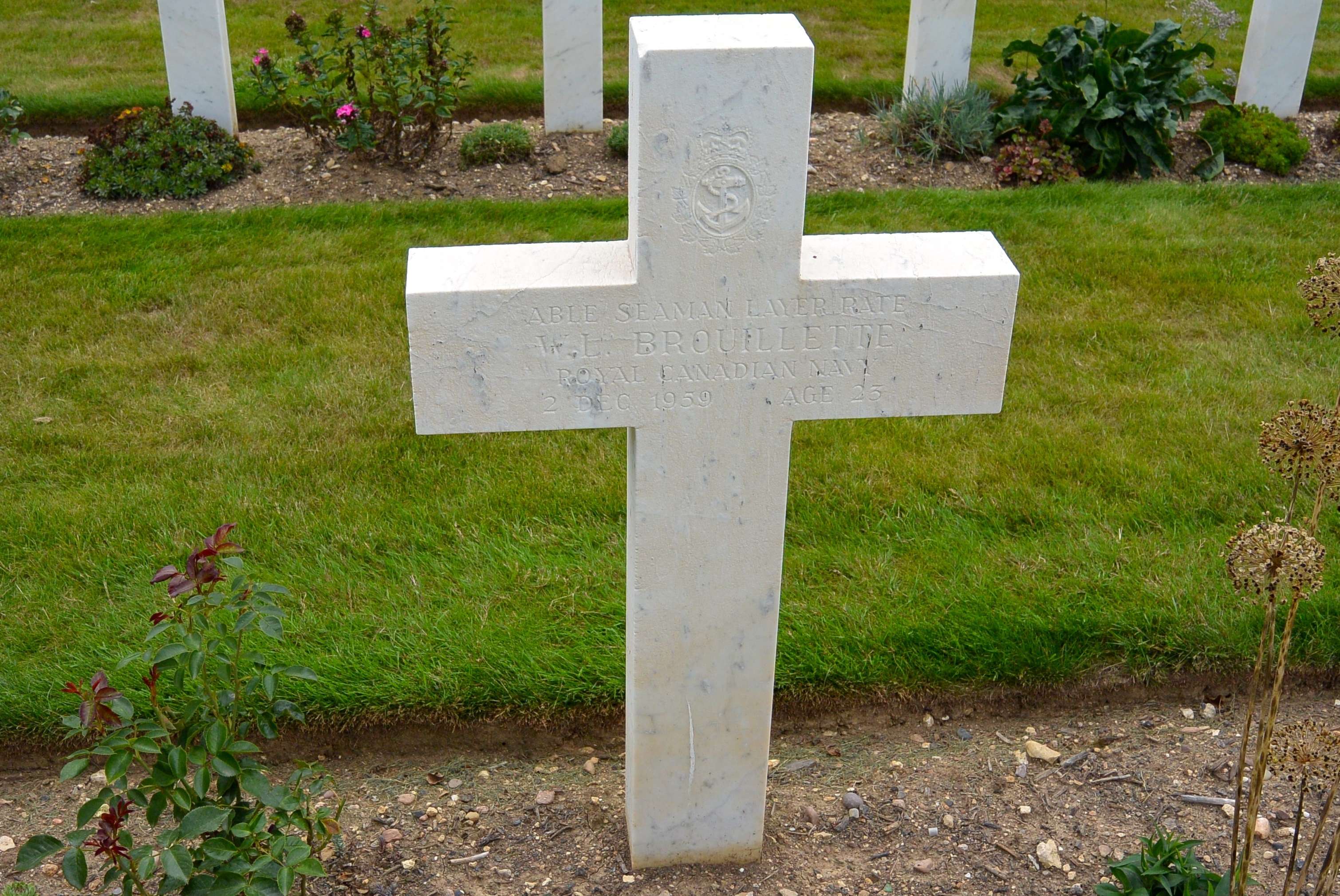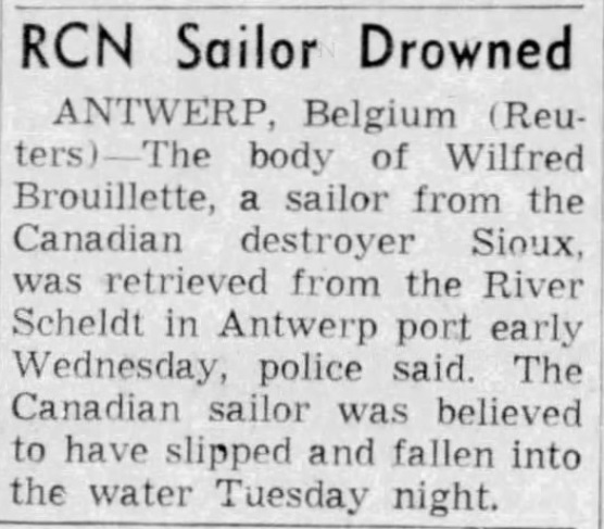AB Brouillette died when he fell from HMCS SIOUX into the River Scheldt in Antwerp, Belgium sometime during then night of 1/2 Dec 1959. He was buried in the Choloy War Cemetery, Meurthe-et-Moselle, France.
