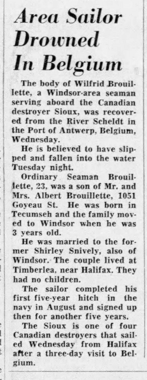 BROUILLETTE, Wilfred L., Able Seaman, RCN, died 02 Dec 1959 - HMCS SIOUX - Son of Mr. and Mrs. Albert Brouillette, Windsor, Ontario; husband of Shirley (née Snively) of Timberlea, Nova Scotia