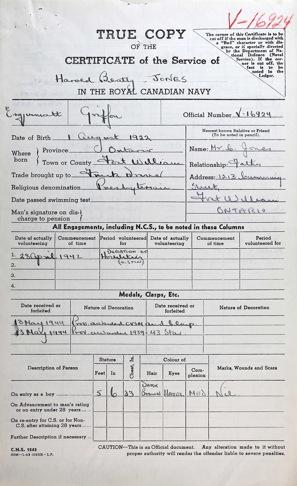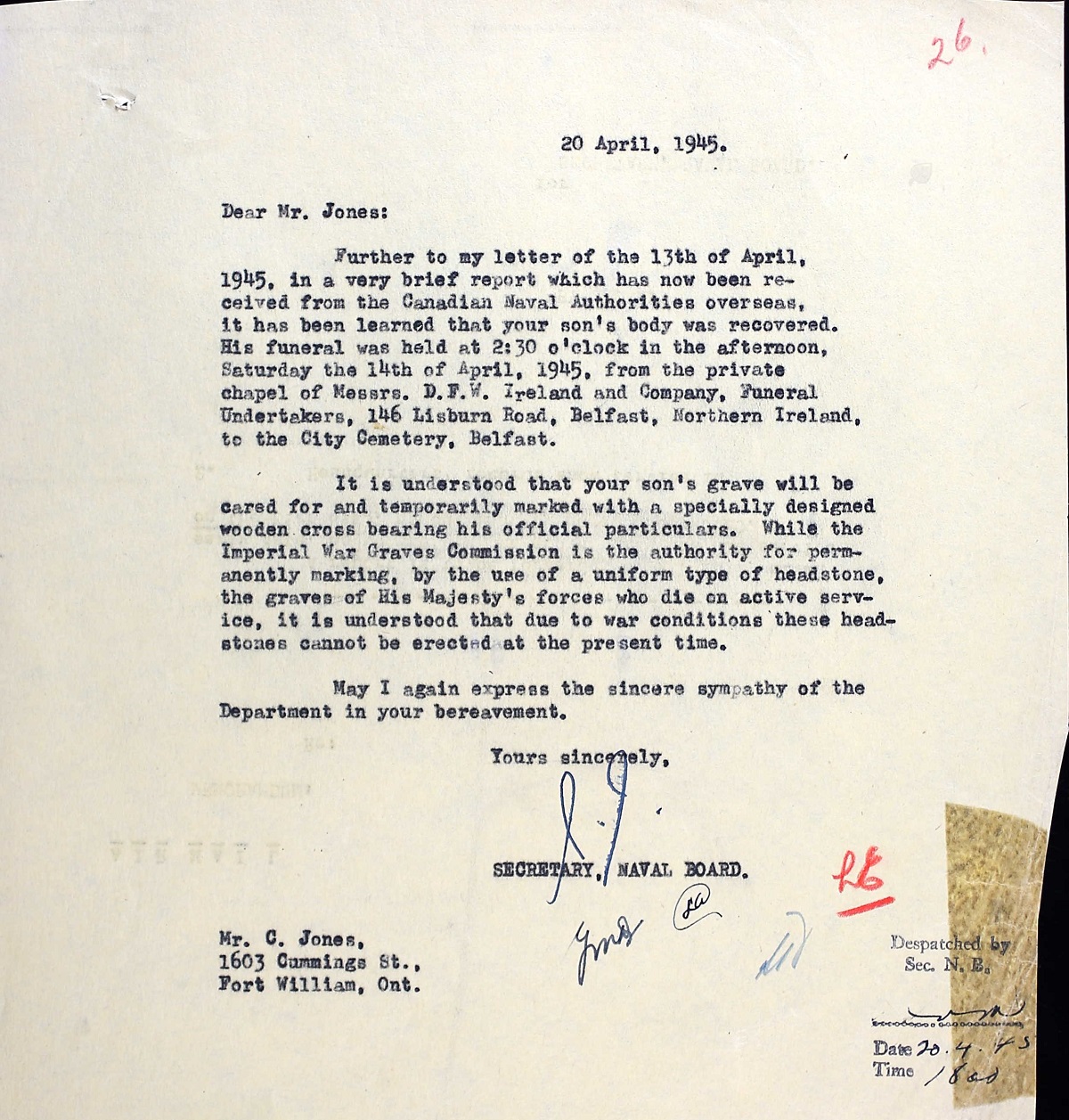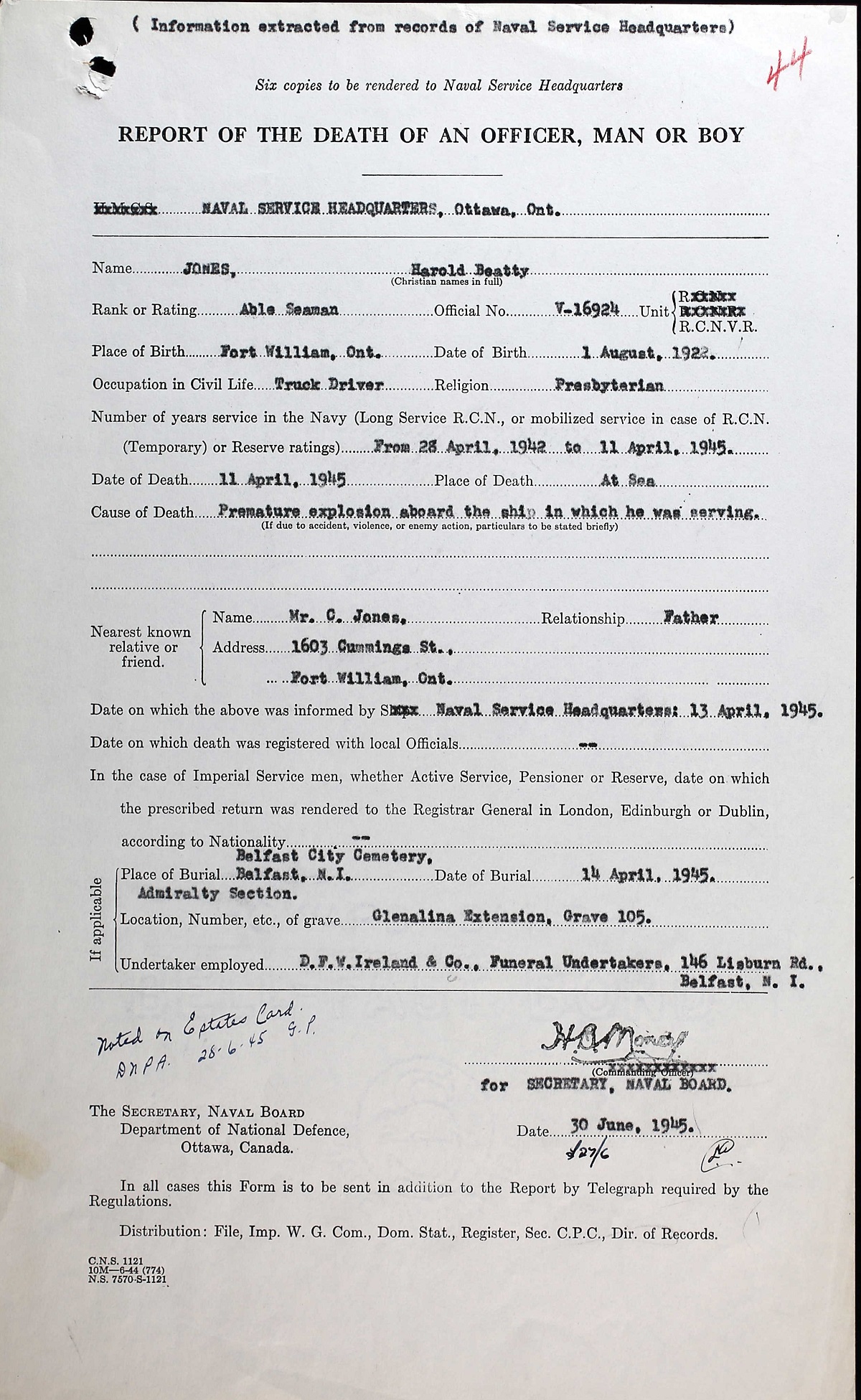JONES, Harold Beatty, AB, V16924, RCNVR killed - 11 Apr 1945, HMCS STRATHADAM - Son of Charles and Mary Dalrymple Jones, of Fort William, Ontario.