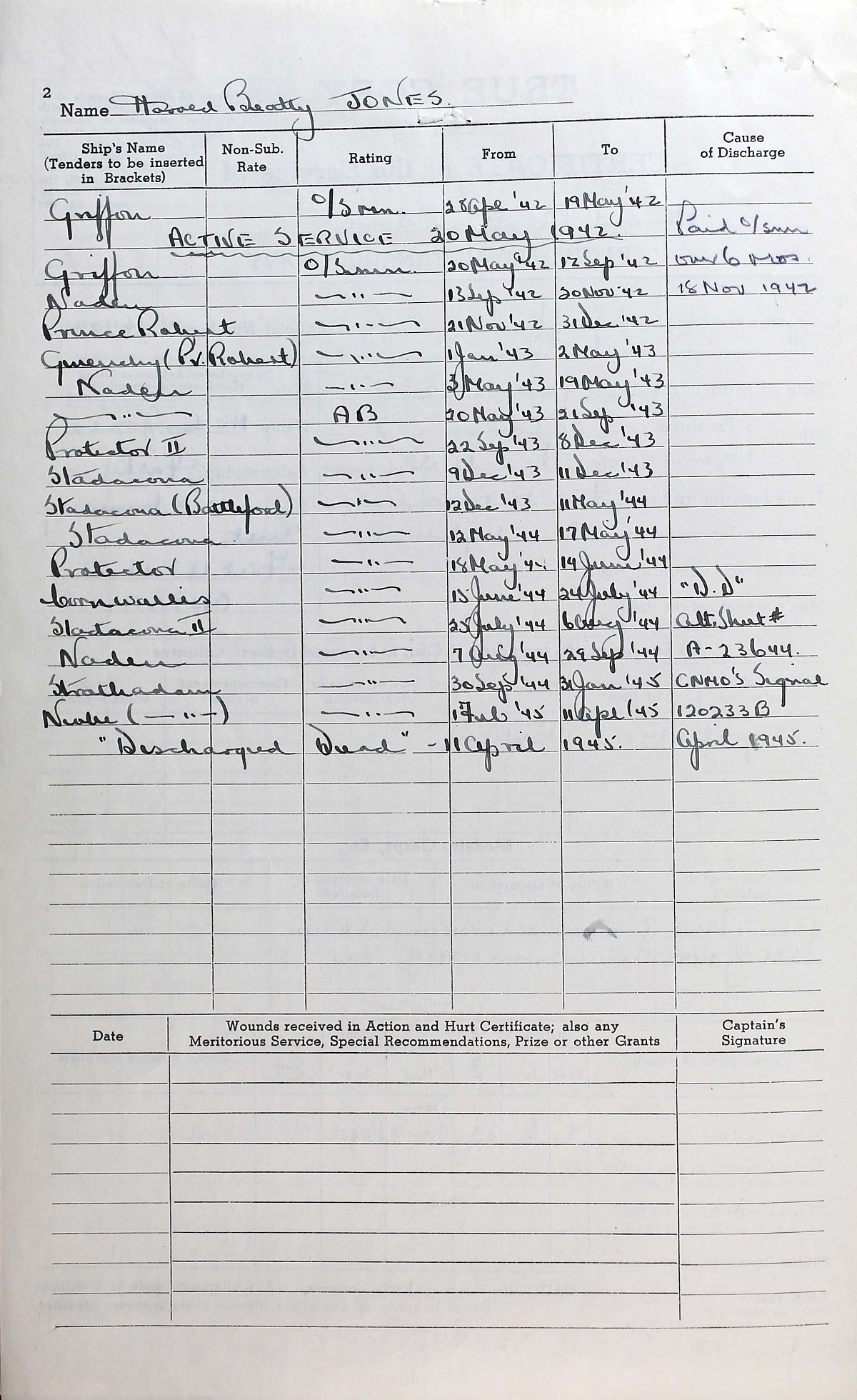 Ships served in: RCNVR DIVISION PORT ARTHUR - Enlisted 28 Apr 1942. Commenced Active Service 20 May 1942 HMCS PRINCE ROBERT - Served in PRINCE ROBERT 21 Nov 1942 - 02 May 1942 as an OS, RCNVR HMCS BATTLEFORD - Served in BATTLEFORD 12 Dec 1943 - 11 May 1944 as an AB, RCNVR HMCS STRATHADAM - Drafted to STRATHADAM 30 Sep 1944 as an AB, RCNVR