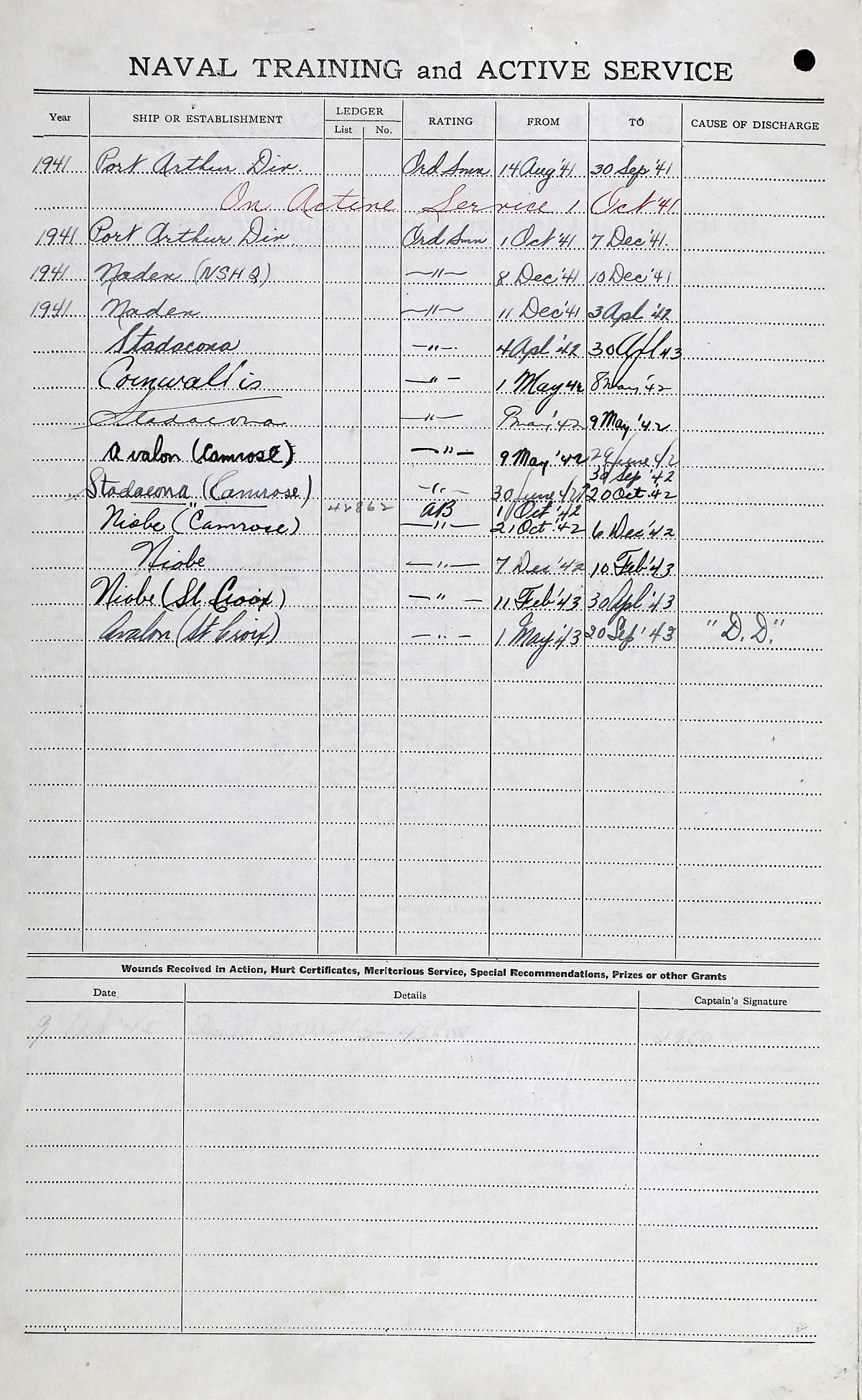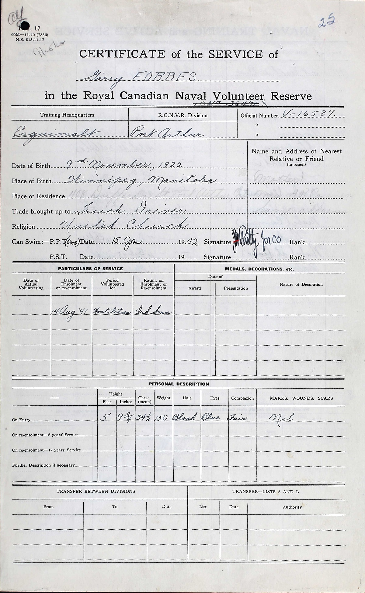 PORT ARTHUR DIVISION RCNVR - Enlisted 14 Aug 1941.  Commenced Active Service 01 Oct 1941