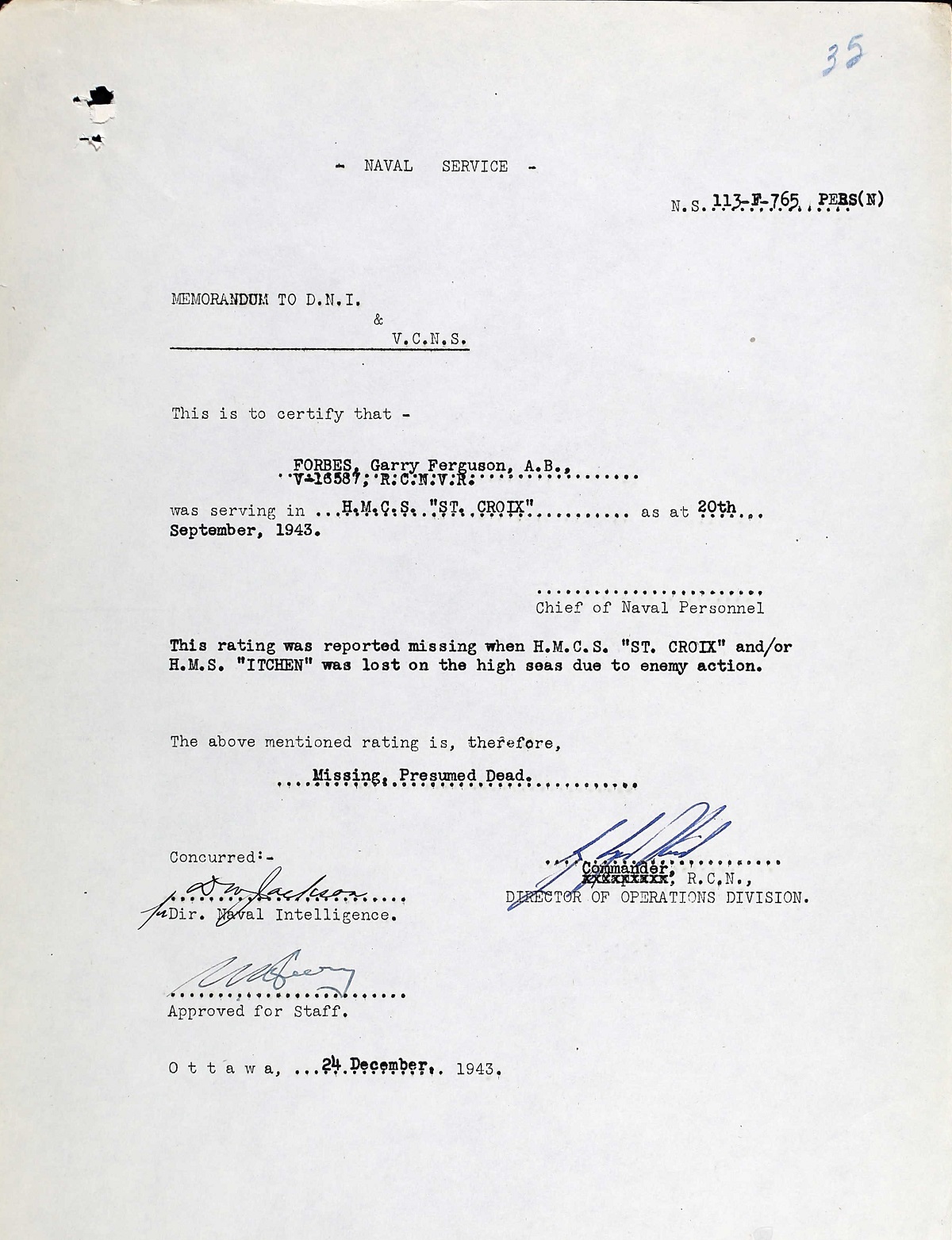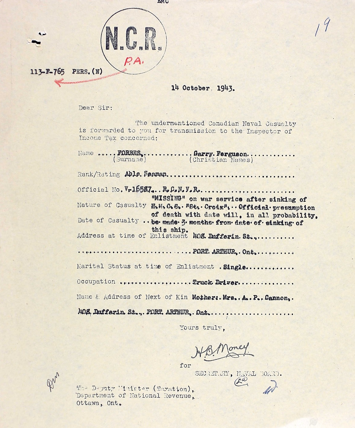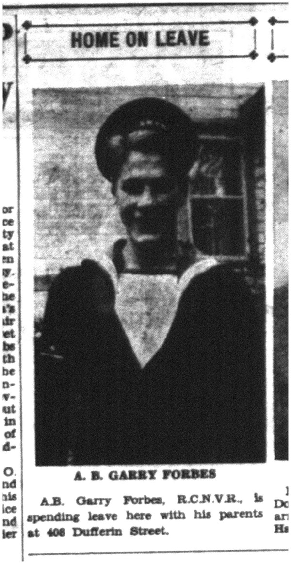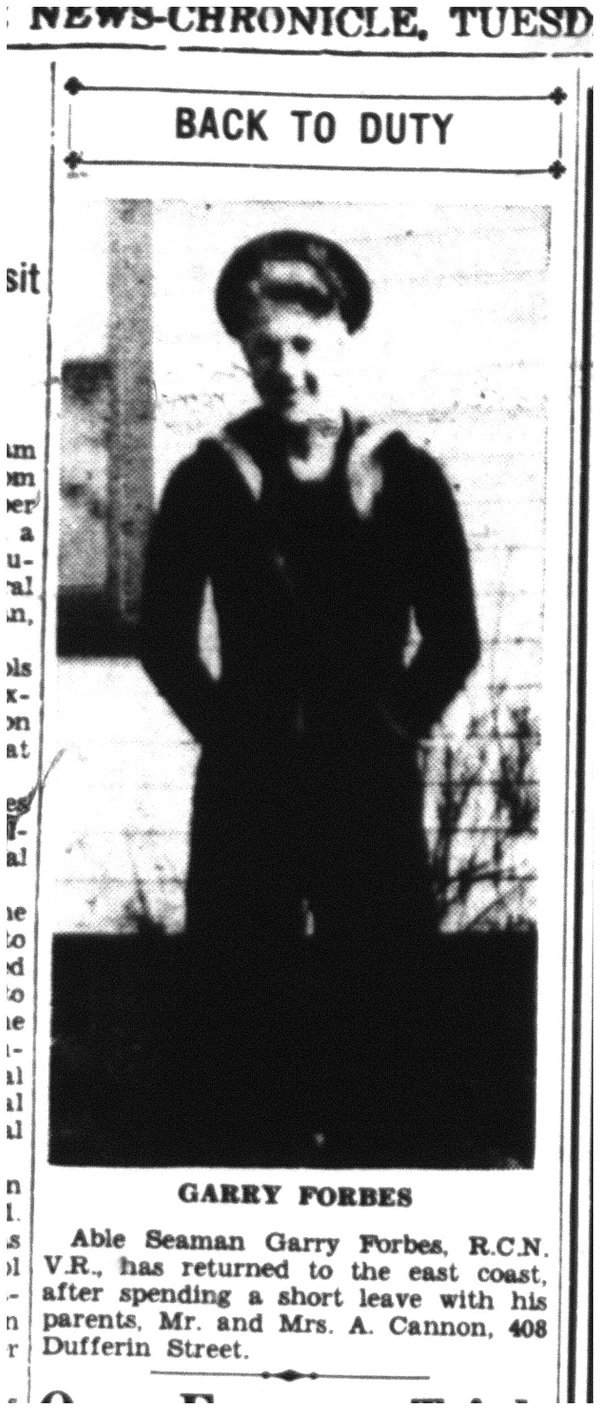 FORBES, Garry Ferguson, AB, V16587, RCNVR, killed - 20 Sep 1943, HMCS ST CROIX - Son of Florence (Mrs. Aubrey Percy Cannon) of Port Arthur, Ontario and the late James Alexander Forbes; brother of Kenneth Cannon and Mrs. C. Lachine of Port Arthur.