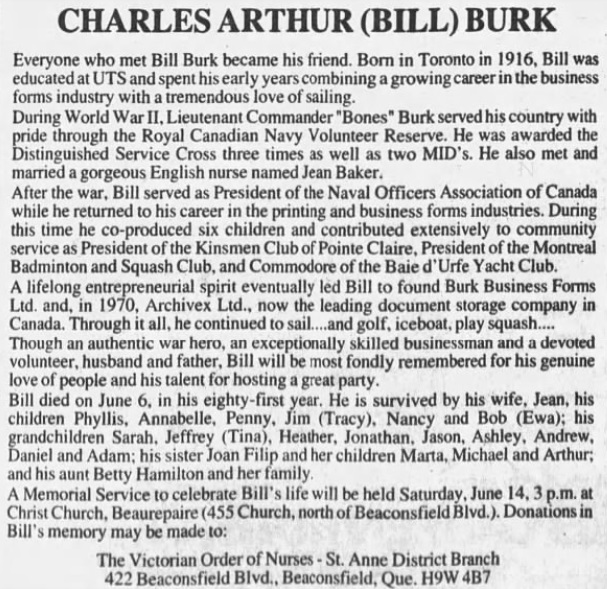 Citation for award of Distinguished Service Cross: BURK, Charles Arthur, Lieutenant, Distinguished Service Cross, RCNVR - MTB-461 Coastal Force - Awarded as per Canada Gazette of 27 May 1944 and London Gazette of 2 May 1944. "For gallant and distinguished services in Light Coastal Craft in successful engagements with the enemy." (Action was on 14 February 1944 when four E-boats were damaged)