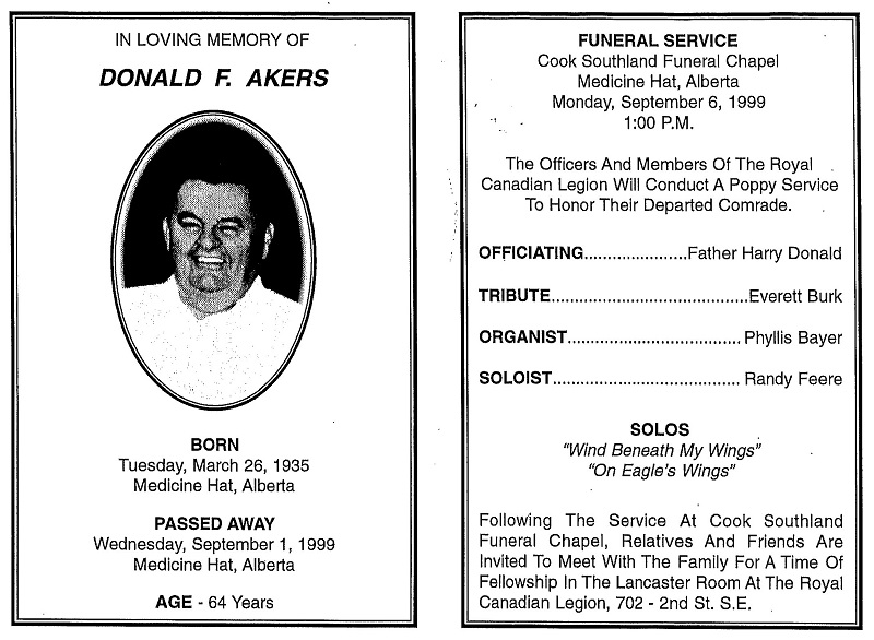 AKERS, Donald F. (Dunk) - It is with great sadness, the family of Donald F. Akers announce the passing of our dear husband, father, and grandfather at the of 64 years on 01 September 1999 in Medicine Hat, Alberta.