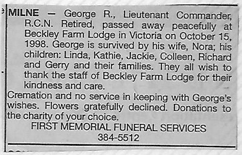 Mentioned in Despatches Citation: MILNE, George Ralph, Yeoman of Signals, 4773, Mention in Despatches, RCN - Awarded as per Canada Gazette of 6 January 1945 and London Gazette of 1 January 1945. "This Rating has at all times displayed outstanding initiative, resourcefulness, and efficiency in carrying out his duties. During action with an enemy U-Boat earlier in the war, his untiring devotion to duty during a prolonged hunt, contributed in a large measure to the success of the operation."