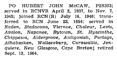Served in the RCNVR 02 Apr 1937 - 07 Nov 1945 as a Telegraphist; the RCN(R) 16 Jul 1946 - 22 Jun 1954; and the RCN 23 Jun 1954 - 12 Sep 1964