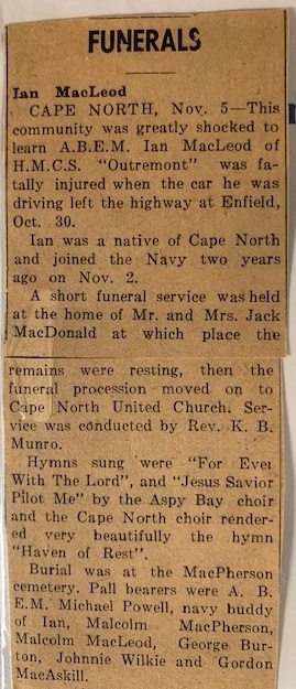 MacLEOD, Ian - Capt North, Nov. 5 - This community was greatly shocked to learn A.B.E.M. Ian MacLeod of H.M.C.S. "Outremont" was fatally injured when the car he was driving left the highway at Enfield, Oct. 30.
