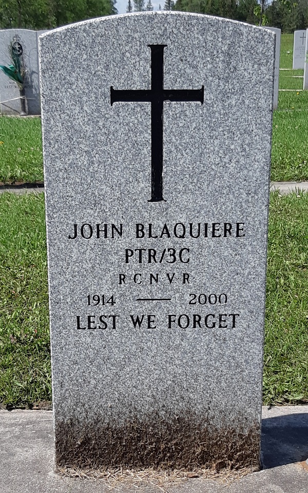 BLAQUIERE, John - After a brief illness, it is with deep sadness that the family of John Blaquiere announces his passing on July 14, 2000 at the Concordia Hospital at age 86. Left to cherish his memory are his special friend and companion Carol Moulin; his children, Gilbert, Lawrence (Dolores), Roland (Janice), Beatrice; numerous grandchildren and great-grandchildren; as well as sisters, Melvina, Corinne and Rosie. He was predeceased by his son Darold, grandson Chad, brothers "Babe" and Gus, and sister Mary. John was employed as a painter for the C.N.R. for 36 years. From 1939 to 1945 he served with the Royal Canadian Navy and was an active member of the Chief and Petty Officers Assoc. He was a life member of the Transcona Royal Canadian Legion #7, which was his second home. He spent many happy years at his cottage in Malachi, Ont. with his family and friends. The family wishes to express sincere appreciation to Dr. J. Ormiston and the nursing staff on the 3rd floor at Concordia Hospital for their compassionate care. If friends so desire, in lieu of flowers a memorial donation may be made to the Heart and Stroke Foundation, 301-352 Donald St., Winnipeg, MB R3B 2H8. Funeral services will be held Tuesday, July 18 at 10:00 a.m. at the Transcona Funeral Chapel, 1800 Day St., with interment to follow at the Transcona Cemetery. (Winnipeg Free Press 16 Jul 2000)
