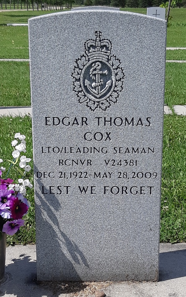 COX, Edgar Thomas - our beloved husband, father, grandfather, great-grandfather, brother, brother-in-law and uncle passed peacefully in his sleep May 28, 2009 at age 86. Affectionately called Pop Dad had an infectious smile, a twinkle in his eye and a wonderful since of humor. He loved his wife Catherine (Kay) and devoted his life to her. Survived by four children Sheila Brisley, Linda (Don deceased) Fox, Carol (Terry) Brisley, Tom (Sharon) Cox; an extended family of ten grandchildren and 15 great-grandchildren. At age 15 Dad started his career with The Hudson's Bay Company (The Bay) in Winnipeg delivering parcels by bicycle. At 17 he enlisted in the Royal Canadian Navy Reserve becoming Leading Torpedoman/Leading Seaman completing two tours of duty. After the war, Dad returned to work for The Bay as an electrician and retired after 47 years of service. He was a handyman with many skills and spent countless hours helping others. Dad's love of family was immeasurable. His last three years were dedicated to the care of his wife. Dad was happiest puttering, devising new tools to help mom, renovating bathrooms, rewiring homes and cottages, that was Pop! He loved sunsets at the beach, gladiolas, his garden, playing the organ, a good game of golf; he enjoyed it all in his own quiet way. Dad was a thinker, always planning, always teaching. The following poem was chosen by Dad. TO MY FAMILY: I go from you gently for it is my time, To take the next step in this journey of mine; Don't grieve for me long - I've not left you alone, For I will be with you In the love that we've known, That love is forever and some day when it's time You'll join me again on this journey of mine. Anonymous. A Celebration of Life will be held at the Transcona Memorial United Church, 209 Yale Ave. West on Wednesday June 3, 2009 at 10:30 a.m., reception to follow. Interment will take place at the Transcona Cemetery at 2:00 p.m. In lieu of flowers the family would appreciate a donation to the Heart and Stroke Foundation. (The Winnipeg Free Press 01 Jun 2009)