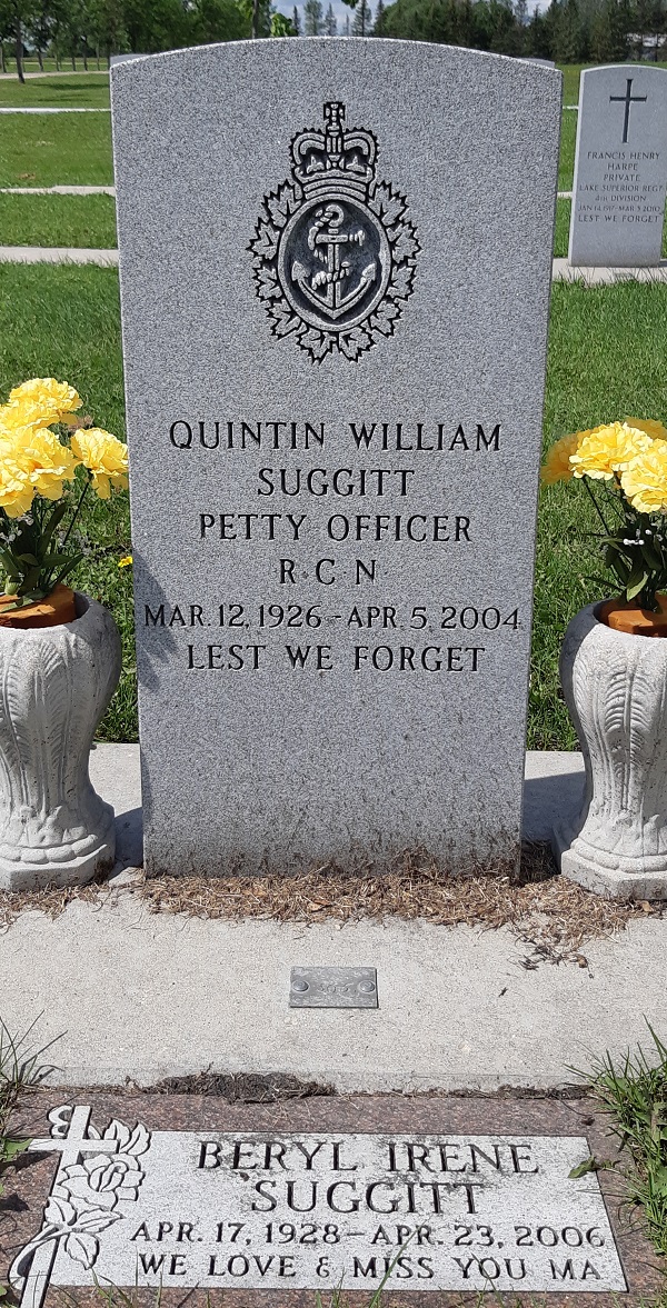 SUGGITT, Quintin William (Red) - Peacefully, on April 5, 2004 at the Concordia Hospital, with his family by his side, Quintin "Red" Suggitt, our beloved husband, father and grandfather, passed away at age 78 years. Red leaves to cherish his memory, his wife of 57 years, Beryl; and their children, Gayle (Roy), Robert (Penny), Rod, Joan (Paul), Christine (Mel), Judy (Tom), Gerald (Cathy), Nancy (Kim), Allan (Kim), Laurence (Mary) 16 grandchildren; a brother Fred of BC; and numerous nieces and nephews. Red and Beryl settled in Transcona in 1959 where they raised their large family with love and understanding. Red was born and raised in Winnipeg, joined the Royal Canadian Navy at the age of 17, serving until his honourable discharge in 1945. He then started a career in the electrical trade, retiring in 1990 from Molsons. Red was a member of the Royal Canadian Legion for 56 years. A devoted husband, father and grandfather, he will be sadly missed by all. At his request there will be no formal service. Please join the family in a celebration of Reds life on Thursday, April 8 at 1:00 p.m. at the Club Room, Transcona Legion, 117 Regent Ave. East. If friends so wish, memorial donations may be made to CancerCare Manitoba. REST IN PEACE DAD Transcona Funeral Chapel in care of arrangements. Make a donation to CancerCare Manitoba Foundation (The Winnipeg Free Press 07 Apr 2004)